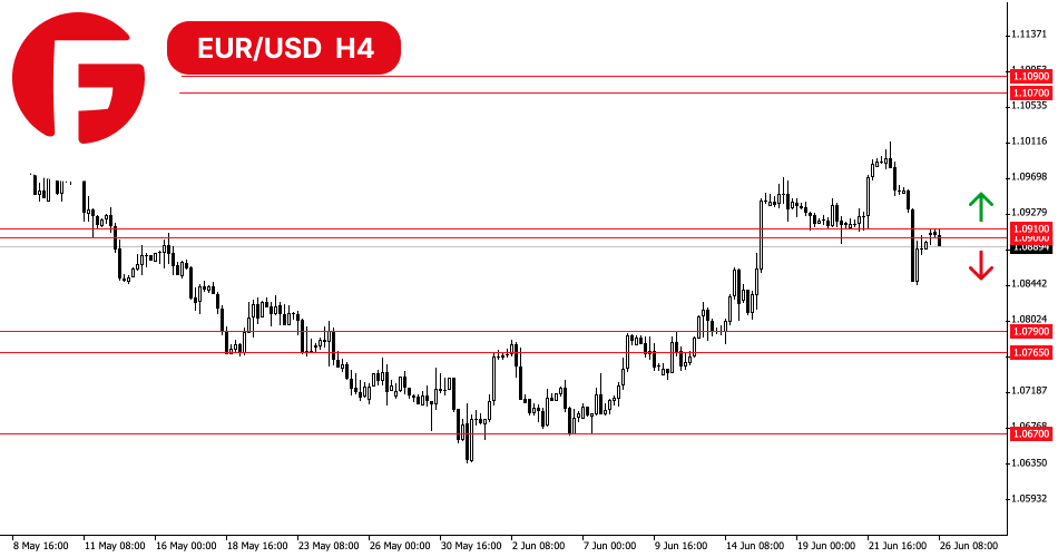 در زمان نوشتن این تحلیل، قیمت جفت ارز EUR/USD کاهش خود را از سر گرفت و از ناحیه انباشت باریک 1.0900 - 1.0910 جهش کرد.