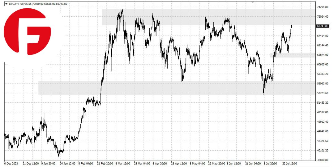 بیت کوین بار دیگر در تاریخ ۲۹ جولای به نشانه ۷۰,۰۰۰ دلار رسید و تنها حدود ۶٪ کمتر از بالاترین قیمت تاریخی خود مانده است.