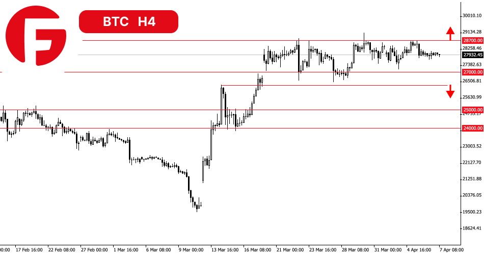 اما بازگشت مجدد قیمتها به زیر سطح روانی 27000 دلار نشان دهنده ضعف آشکار خریداران است که به طور قابل توجهی احتمال سناریوی نزولی را افزایش می دهد. و تنها بازگشت قیمتها به بالاب 28700 دلار به ما امکان را می دهد تا روی رشد بیشتر تا 32000 دلار حساب کنیم.