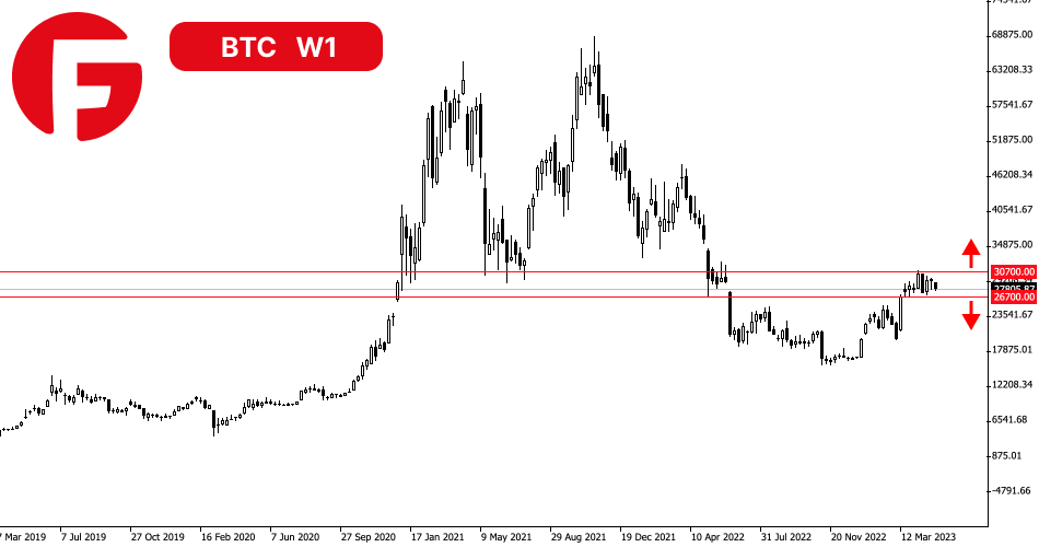 برای هشتمین هفته است که بیت کوین در یک کانال جانبی پهن بین 26700 تا 30700 دلار حفظ شده است. البته این مدت زیادی برای این دارایی به حساب نمیاد، چراکه در دوره زمانی از اواسط سال 2019 تا اواسط سال 2020، بیت کوین نیز در فاز عدم اطمینان قرار داشت. اما با این حال، اکنون لحظه بسیار مهمی برای معامله گران و سرمایه گذاران است. قیمتها در کانال جانبی از 26700 تا 30700 دلار گیر کرده اند که در سال 2021 و در زمان فروپاشی اقتصاد جهانی در سال 2022 به عنوان محدودهٔ حمایتی عمل کرد.