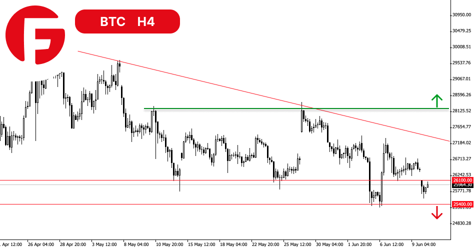 بیت کوین در محدوده یمتی باریکی بین 25400 تا 26100 گیر کرده است. ضمنا، به ترتیب شکل گیری ماکزیموم هایی که در حال سقوط هستند توجه کنید. این نشان دهنده ضعف خریداران است و در نتیجه احتمال کاهش بیشتر قیمت ها را افزایش می دهد.
