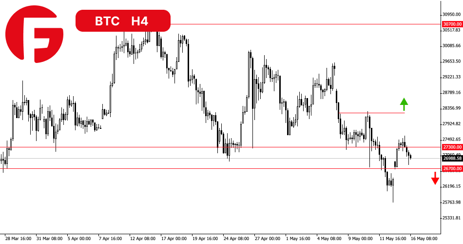 بیت کوین به منطقه انباشت 26700 تا 27300 دلار بازگشت. از آنجایی که این محدوده قیمتی بسیار باریکی است، BTC نمی تواند برای مدت طولانی در آن باقی بماند. شکسته شدن مرز پایینی این محدوده احتمال بازگشت به 25000 دلار و در ادامه به 24000 دلار را به میزان قابل توجهی افزایش می دهد.