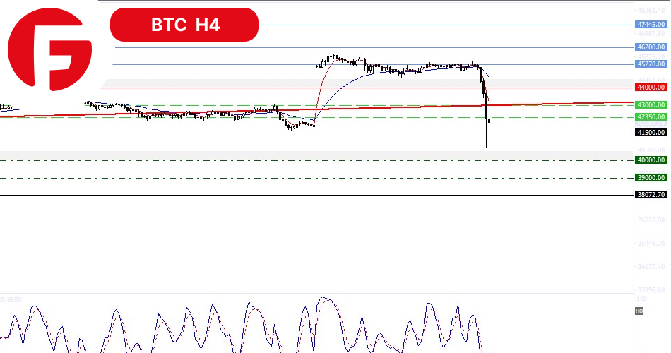 سطح حمایتی 41500 دلار به صورت کامل شکسته نشد و به نظر میرسد که جلوی سقوط بیشتر قیمتها را خواهد گرفت. اما تثبیت قیمتها در پایین این سطح سیگنال بسیار قوی نزولی خواهد بود که ممکن است باعث افت بیشتر قیمتها شود.