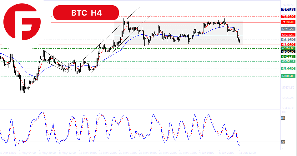 با نگاهی به نمودار به خوبی میشود فشار شدید فروش بر این رمز ارز را مشاهده کرد. همانطور که پیش بینی شده بود با عبور قیمتها از سطح حمایتی 68518 دلار قیمتها به 67550 دلار رسیدند و به نظر میرسد که فروشندگان همچنان نیروی لازم برای ادامه حرکت نزولی را دارند.