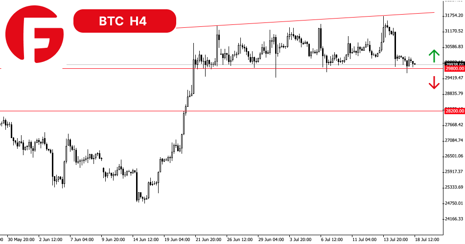 اگر SEC یک یا چند برنامه را برای ایجاد ETF بیت کوین تأیید کند، سناریوی صعودی فعال خواهد شد. برای مثال، در 13 جولای، کمیسیون بورس و اوراق بهادار ایالات متحده (SEC) به طور رسمی برنامه های بیت کوین ETF از BlackRock، WisdomTree، VanEck و دیگران را برای بررسی پذیرفت. هیاهو در مورد ETF بیت کوین همچنان بالاست و نشان دهنده موفقیت قریب الوقوع یکی از متقاضیان است. تنها سوال، زمان آن است که بسیار مهم است. چراکه، اگر در روزها یا هفته های آینده اخبار مثبتی در مورد این موضوع نشنویم، بیت کوین به زیر 29800 دلار سقوط می کند.
