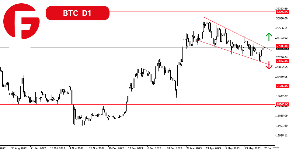 اما قبل از شکست سطح مقاومتی و در عین حال روانی 27000 دلار، احتمال از سرگیری حرکت نزولی همچنان بالاست، زیرا قیمت بیت کوین همچنان در کانال باریک نزولی قرار دارد.