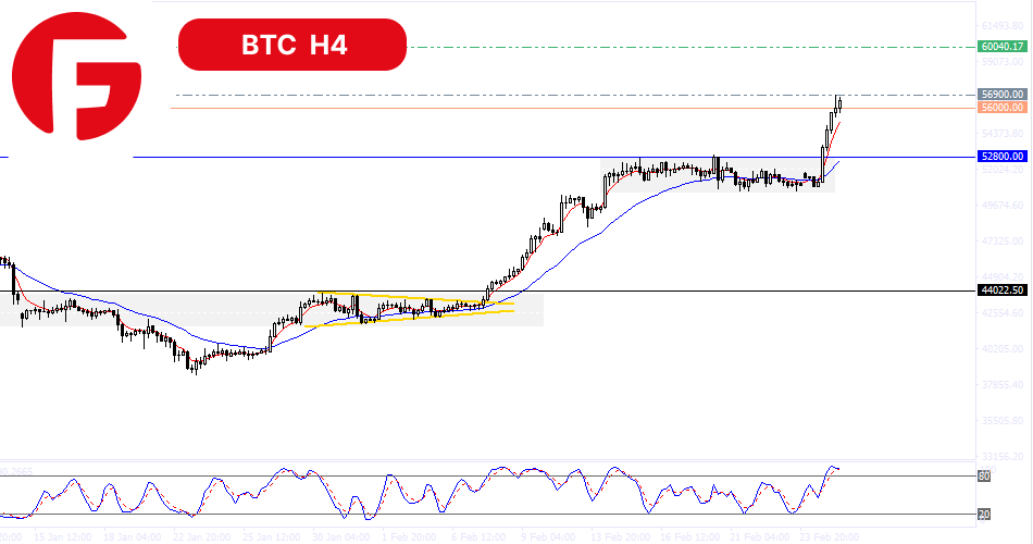 با فعالیت شدید خریداران سطوح مقاوتی از 52800 تا 56000 دلار شکسته شدند. اما سطح مقاومتی 56900 دلار مانع ادامه رشد قیمتها شد و در حال حاضر خریداران یک بار دیگر به سمت این سطح مقاومتی در حرکت هستند تا شانس خود را برای عبور از این سطح امتحان کنند.