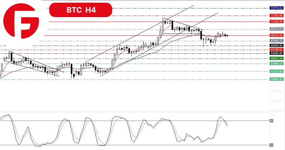 امروز رشد بیت کوین تا حدودی متوقف شده است و خریداران هنوز به طور کامل نتوانسته اند از سطح مقاومتی 68518 دلار عبور کنند. اما در کوتاه مدت احتمال ادامه رشد برای بیت کوین وجود دارد اما برای تایید آن یمتها باید خود را به بالای سطح مقاومتی 69715 دلار برساند. البته سیگنال خرید قوی با شکسته شدن سطح مقاومتی 71180 دلار دریافت خواهد شد.