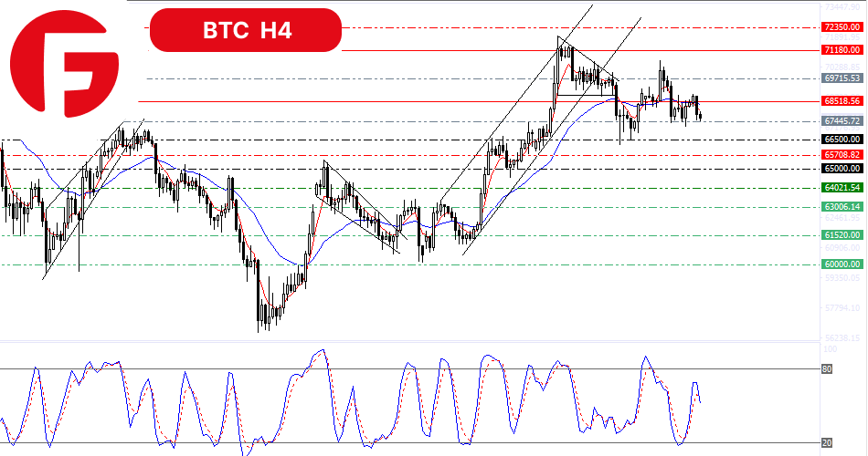 در حال حاضر فروشندگان فشار زیادی وارد میکنند تا سطح حمایتی 67445 دلار را نیز بشکنند که در این صورت احتمالاً شاهد افت قیمتها تا سطح روانی 66500 دلار خواهیم بود. باید توجه داشت که شکسته شدن این سطح به عنوان یک سیگنال فروش نسبتاً قوی عمل خواهد کرد و احتمال افت تا 65700 و یا حتی 65 هزار دلار را بسیار بالا خواهد برد.