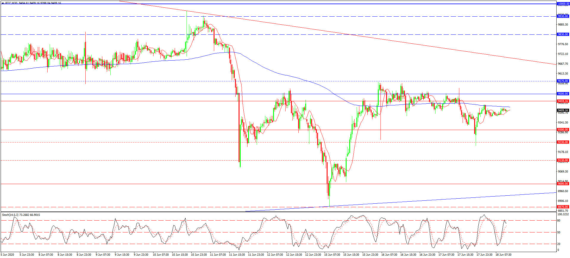 فشرگی نوسانی بیتکوین در چهارچوب کانال افقی 9230.0-9570.0 هنوز ادامه داشته و تا قبل از خروج قیمت از این بازه، با ابهام رو به روایم. در حال حاضر با نزدیک شدن قیمت به سقف کانال و سطوح 9500.0-9570.0 رو به رو هستیم. این برخورد می تواند افت کوتاه مدت را به دنبال داشته باشد. توجه داشته باشید که برخورد با این بازه می تواند به افت میان مدت نیز بی انجامد. افت پایین تر از 9370.0 به شکست 9300.0-9230.0 نیز خواهد انجامید. اما در صورت افت پایین تر از 9230.0 گرایش نزولی در میان مدت ادامه خواهد یافت و می تواند به خط ترند صعودی که از اواسط می ادامه دارد نیز، برسد.