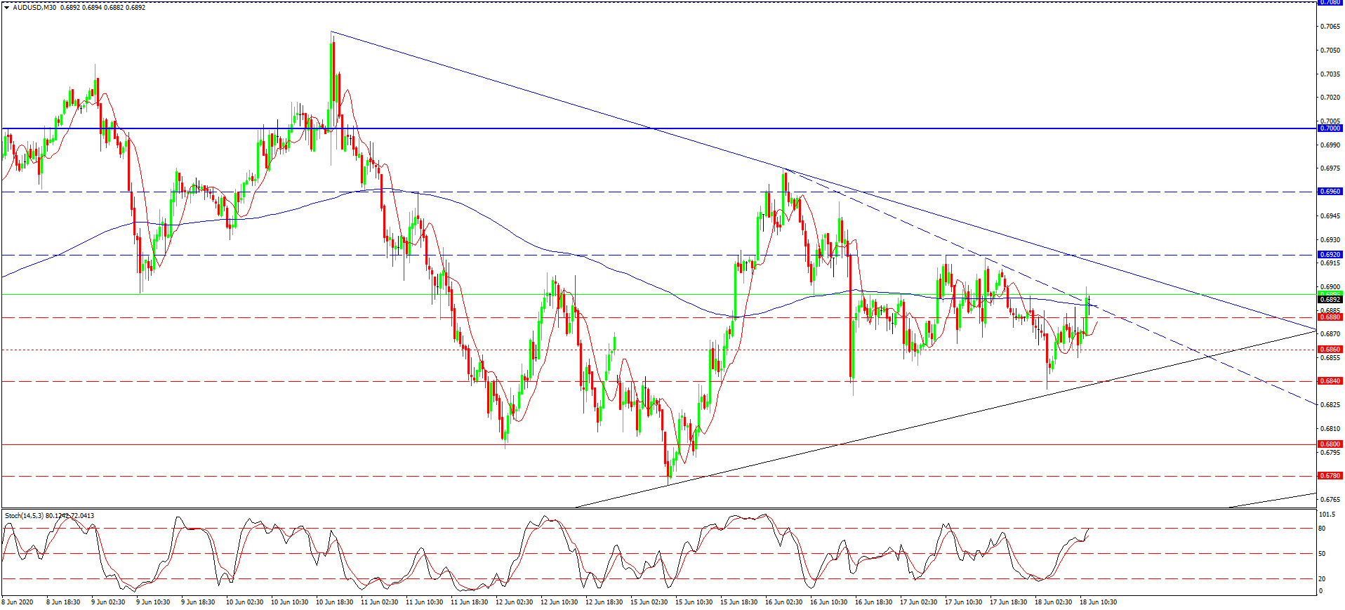 در حال حاضر با بازگشت قیمت بعد از برخورد با خط ترند نزولی رو به رو هستیم که از اواسط ماه جاری ادامه داشته. احتمال افزایش قیمت دلار در طی جلسات معاملاتی امروز ایالات متحده می تواند به این افت ادامه دهد. مسلما شکست 0.6880 می تواند به کاهش بیشتر نرخ گذاری ها تا مرز 0.6860 و حتی 0.6840 نیز بی انجامد. در نظر داشته باشید که فشاری که افزایش دلار ایالات متحده بر این جفت ارزی می آورد در آینده بیشتر خواهد شد. ولی فعلا باید مراقب برخورد آتی قیمت با خط ترند صعودی بود، که از اواخر ماه مارچ ادامه داشته. شکست این خط به موازات سطح پشتیبانی 0.6840 به ضربانی نزولی تا مرز 0.6800 خواهد انجامید.