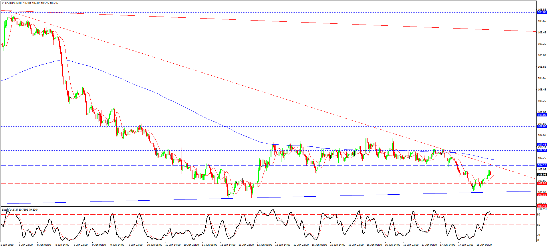 اخیرا نرخ گذاری ها با خط ترند صعودی برخورد کرده اند، که از اوایل ماه می ادامه داشته است. برخورد با این خط ترند به موازات سطح هدفی 106.70 به انعکاس یابی گرایش نزولی انجامید. ادامه یابی افت بیشتر سهام ایالات متحده، بر اثر افزایش احتمالات مربوط به از سر گیری موج دوم ویروس، به موازات افزایش بیشتر قیمت دارایی های حفاظتی می تواند باعث فشردگی نرخی میان مدت این جفت ارزی گردد. افت قیمت سهام با افزایش دلار و بحرانی شدن شرایط اقتصاد جهانی با افزایش ین همراه خواهد گردیدی که می تواند باعث ایجاد روندی افقی در نمودار این جفت ارزی گردد. معاملات خرید را بعد از شکست مقاومت 107.04-107.12 باز می کنیم. چرا که برخورد آتی قیمت با این بازه می تواند افت اصلاحی دلار را به همراه داشته باشد.