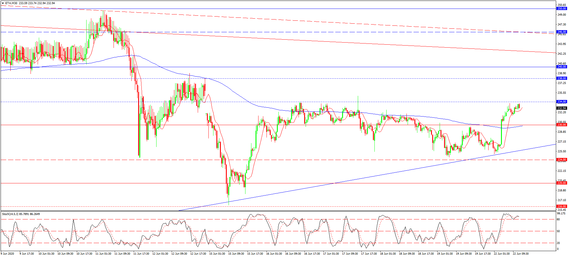 در حال حاضر قیمت اتر به ماکسیموم موضعی 234.00 نزدیک شده. این نزدیکی می تواند افت موقت قیمت تا مرز 232.00 را به دنبال داشته باشد. مسلما تا قبل از شکست این مینیموم موضعی گرایش صعودی در اولویت است، ولی فعلا احتمال افت اصلاحی وجود دارد. تنها در صورت شکست مینیموم موضعی یاد شده گرایش نزولی می تواند تا مرز سطح هیجانی 230.00 نیز ادامه یابد. در نظر داشته باشید، که 230.00 نهایت پتانسیل نزولی است، و در صورت شکسته شدن این سطح قیمت می تواند تا خط ترند صعودی که از اواسط مارچ ادامه داشته نیز سقوط کند. یعنی تا سطوح 228.00 و یا 226.00. تا قبل از شکست 232.00 و 230.00 گرایش صعودی در میان مدت در اولویت قرار دارد.