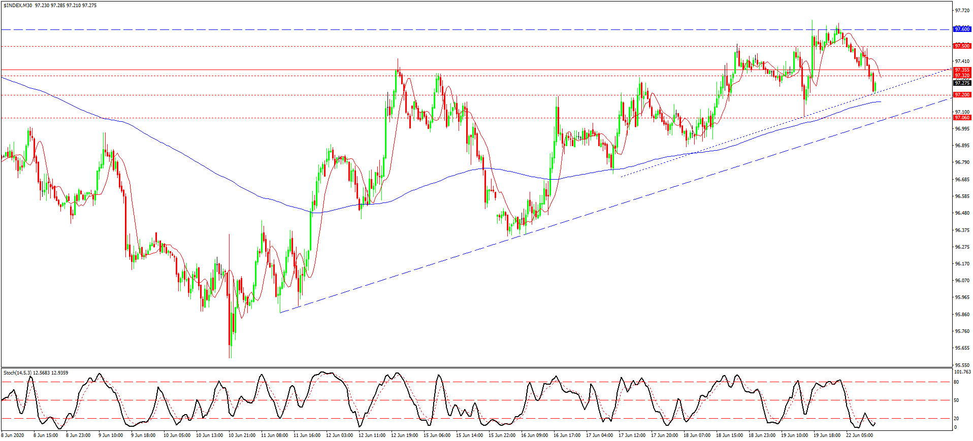 شاخص دلار بر اثر افزایش هفته اخیر سهام ایالات متحده و همچنین احتمال اختصاص دوباره بودجه محرک اقتصادی سیستم ذخایر فدرال، افت نمود. این افت نرخ شاخص دلار را در حال حاضر به خط روند رسانده. به همین دلیل، حتی با وجود احتمال افت بیشتر این واحد ارزی، برخورد با 97.20 می تواند از افت دلار در کوتاه مدت جلوگیری کند. ایست روند نزولی بعد از برخورد با مینیموم 97.06 نیز امکان پذیر است. البته افزایش نرخی همواره از سر گرفته شده و مسلما انعکاس از خط ترند صعودی می تواند با افزایش بیشتر دلار، تا اوایل جلسات معاملاتی آمریکا همراه گردد. چرا که آمار منفی امروز جلسات معاملاتی آمریکا، دلار را به هر حال تضعیف خواهند نمود. فعلا با ادامه یابی افزایش موقت رو به رو می باشیم که بعد از برخورد با خط ترند صورت گرفته.