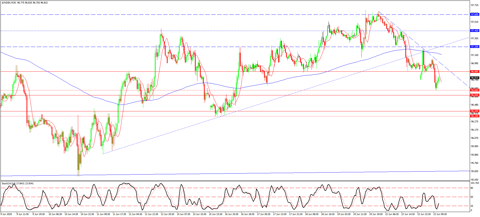 خطوط روندی که از دفعه قبل ترسیم کرده بودیم، شکسته شدند و نرخ گذاری های شاخص دلار به ترتیب سطوح هدفی 96.88 و 96.80 را شکستند. البته با وجود شکسته شدن مینیموم موضعی 96.72 نرخ گذاری ها دوباره بر فراز این سطح برگشته اند. یکی از مسائلی که باعث از سر گیری افزایش دلار شد، پریشانی دیروز اعضای بازار سهام و همچنین چشم انداز افت آتی یورو، بعد از اجرای پروژه تزریق اسنکاس بانک مرکزی اروپا به بازار می باشد. افزایش آتی دلار بستگی به افت بیشتر یورو و پوند داشته، که چندان امکان پذیر به نظر نمی رسند. به همین دلیل نیز، معاملات خرید دلار و فروش یورو و پوند را تا شکست مقاومت 96.88 و 97.00 نمودار USDX به تعویق می اندازیم.
