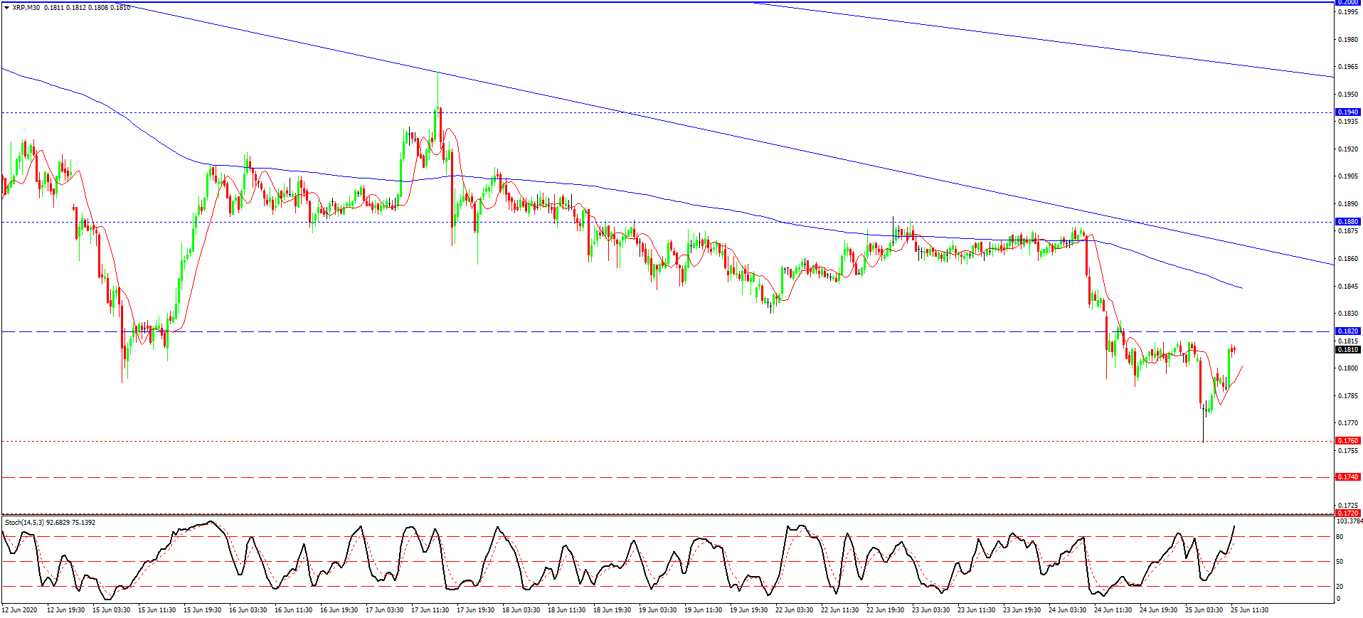 قیمت ریپل همانند تمام ارزهای دیجیتال در پی افت اخیر کاهش پیدا کرد. خط ترند نزولی را در نظر داشته باشید. این خط پتانسیل افزایش اصلاحی و موقت را نشان می دهد. شکست ماکسیموم موضعی 0.1820 می تواند با افزایش مابعد تا سطوح 0.1840 و یا حتی 0.1880 نیز ادامه یابد. در ضمن خط ترند نزولی به موازات سطح 0.1860 عبور می نماید که به احتمال زیاد باعث متوقف شدن موقت افزایش اصلاحی خواهد شد. بازه پشتیبانی شامل سطوح 0.1780 و 0.1760 می باشد.