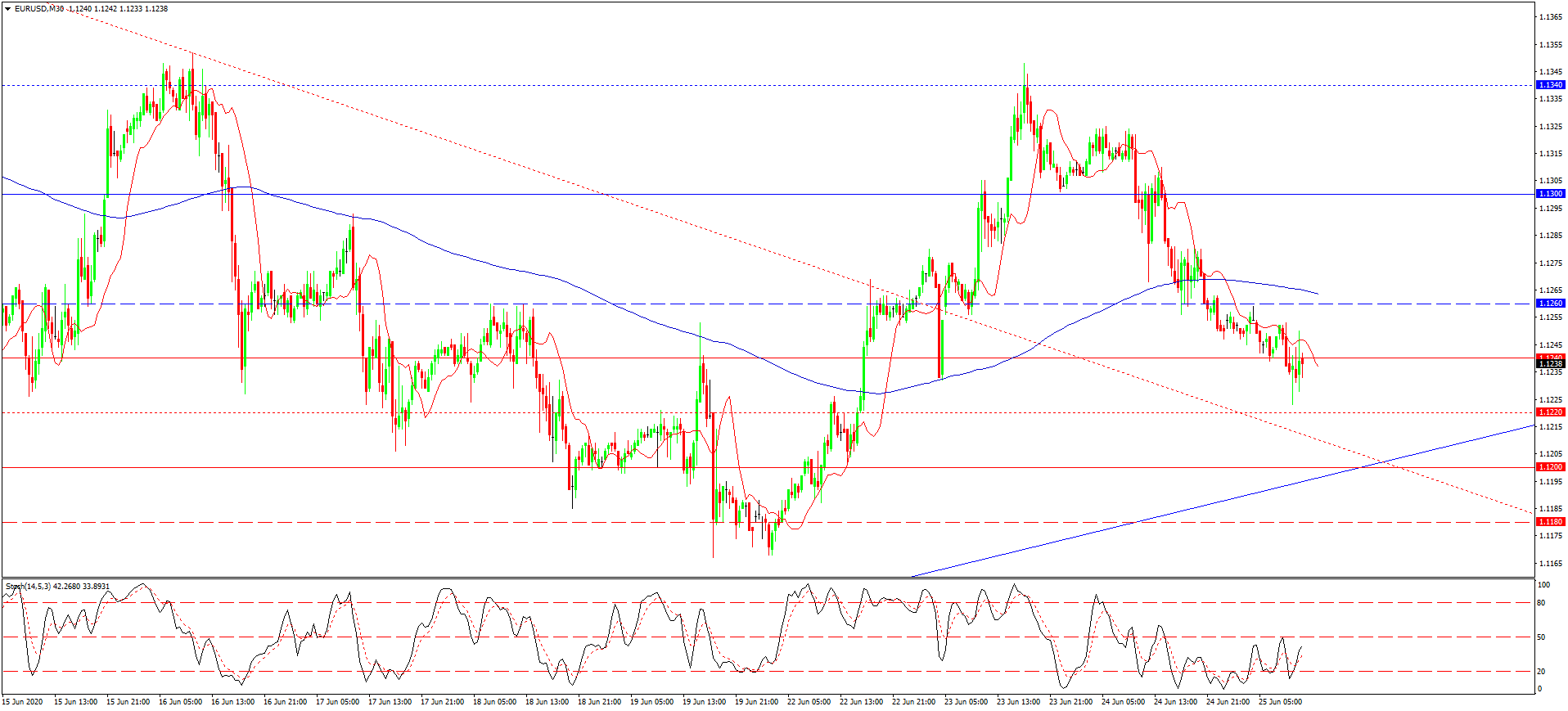 شکست خط ترند نزولی به تاریخ 23 ژوئن، باعث افزایش بعدی قیمت یورو تا مرز سطوح هدفی 1.1300 و ماکسیموم موضعی 1.1340 شد. ولی افت اخیر سهام و افزایش دلار از نهاد بازار، که از نظر تکنیکی احتمالش را می دادیم، از افزایش بیشتر یورو جلوگیری کرد. افت نرخی دوباره این جفت ارزی را به زیر 1.1300 برد. در حال حاضر با احتمال شکست پشتیبانی 1.1220 و افت مابعد تا سطوح 1.1200 و حتی 1.1180 نیز رو به رو هستیم. تنها عامل شکل گیری چنین سناریویی، افت بیشتر سهام و افزایش دلار ایالات متحده به شمار می رود.