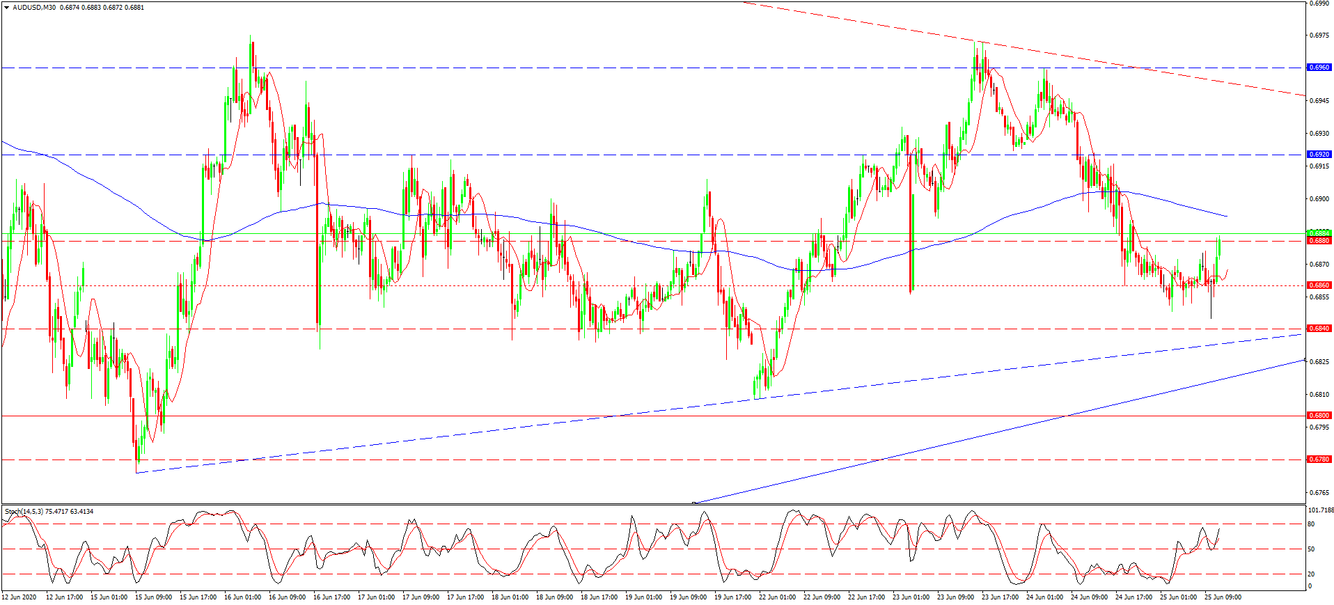 همانطور که دیر تر بیان شد، افزایش دلار از نهاد بازار منجر به افت قیمت این جفت ارزی بعد از برخورد با خط روند نزولی در سطح 0.6960 شد. این افت تا پشتیبانی 0.6840 ادامه یافت. البته فعلا با تحکیم یابی اصلاحی و موقت نرخ گذاری ها رو به رو هستیم. شکست آتی مقاومت 0.6880 می تواند به رشد بیشتر نرخ گذاری ها تا مرز 0.6900 و یا حتی 0.6920 بی انجامد. بر فراز آخرین سطح یاد شده با عبور خط ترند نزولی رو به رو هستیم. تا قبل از از سر گیری رشد سهام و بهبود یابی شرایط تجاری ایالات متحده با چین، سناریو صعودی بعید به نظر می رسد. مسلما بد شدن شرایط یاد شده می تواند شکست پشتیبانی 0.6860 و حتی مینیموم موضعی 0.6840 را نیز، به دنبال داشته باشد.
