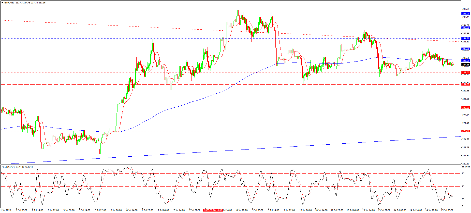از دفعه قبل به تاریخ 8 ژوئیه که در مورد اتریوم نوشته بودیم، قیمت به افزایش ادامه داد و همانطور که طبق سیستم تجاری ما وضع شده: بعد از شکست خط روند نزولی، با برخورد مابعد قیمت با ماکسیموم موضعی 246.00 رو به رو شدیم. مسلما برخورد با ماکسیموم نزولی روند میان مدت را تغییر داد. افت از سر گرفته شد و اصلاح نرخی تا مرز مینیموم 234.00 ادامه یافت. برخورد با نهاد بازار گرایش نزولی را فعلا متوقف کرده. ولی فشردگی قیمت به نهاد بازار و کاهش متداول ماکسیموم ها، چندان سیگنال خوبی به نظر نمی رسد. تا قبل از شکست 238.00-240.00 از اجرای معاملات خرید دوری می ورزیم.