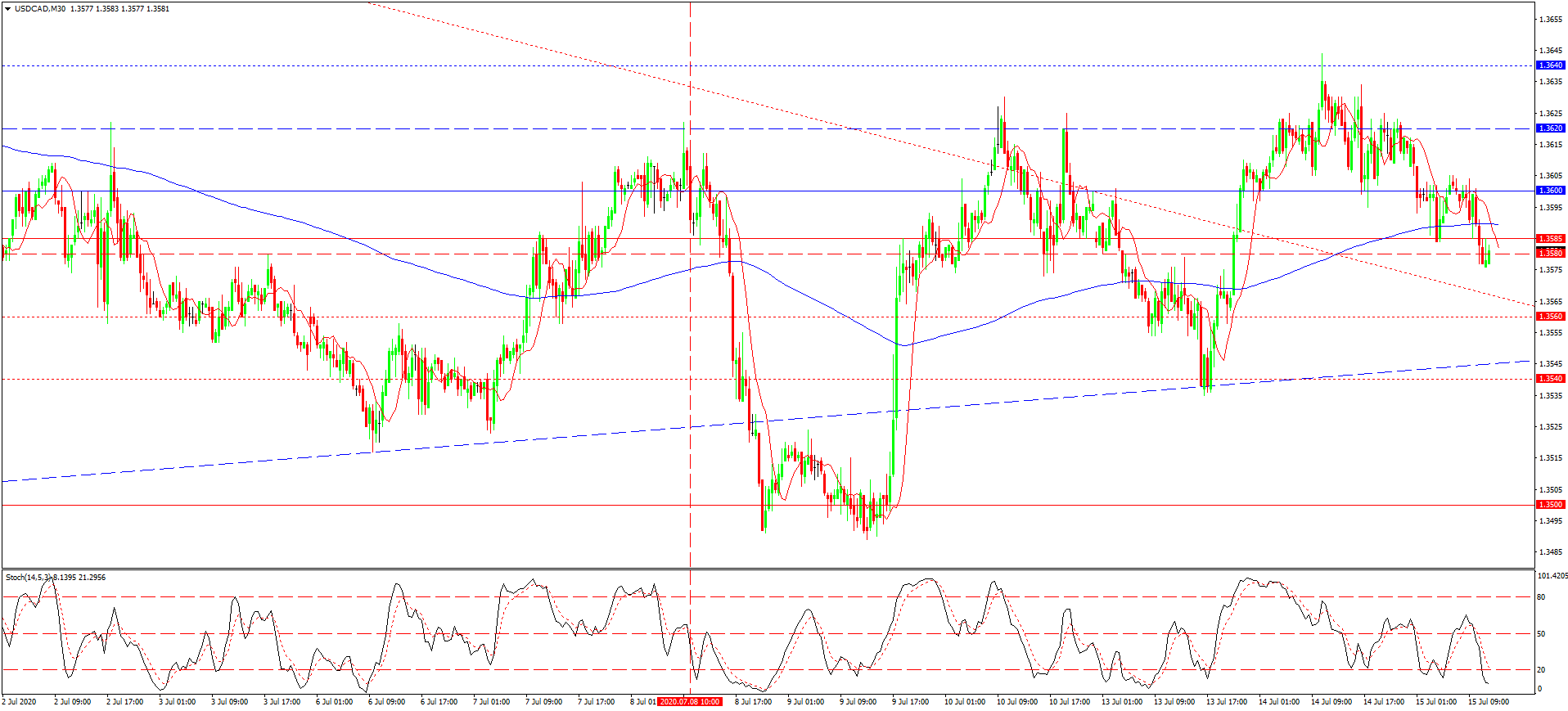 از دفعه قبل به تاریخ 8 ژوئیه که در مورد این جفت ارزی نوشته بودیم، با نزدیک شدن قیمت نفت به نهاد بازار و نزدیکی قیمت این جفت ارزی به خط روند بلند مدت رو به رو بودیم. احتمالات مبنی بر انعکاس گرایش بود که مسلما رخ داد و نرخ گذاری ها را راهی نهاد بازار کرد. در این بین حتی اینجا هم شکست خط روند صعودی، به برخورد مابعد قیمت به مینیموم موضعی 1.3500 منجر شد. افزایش بعدی تا خط روند بلند مدت و مماکسیموم 1.3620 ادامه پیدا کرد. دیرتر حتی این سطح هم شکسته شد ولی به هر حال قوه دلار آمریکا در برابر افزایش قیمت نفت ناتوان است. مسلما قیمت از بازه مقاومت 1.3640-1.3620 انعکاس پیدا کرد و الان هم در حال شکستن 1.3580 است، که به احتمال زیاد افت بیشتر تا مرز 1.3560 و یا حتی 1.3540 را هم به همراه خواهد داشت.