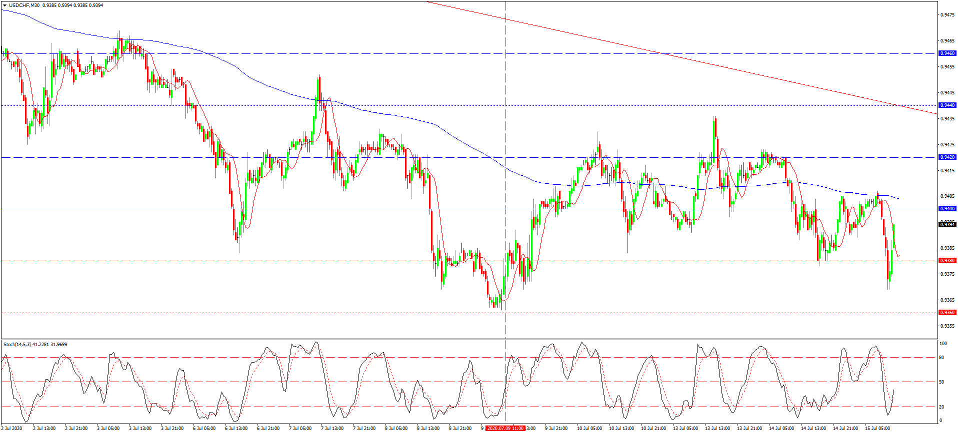 به تاریخ 9 ژوئیه که برای آخرین باز در مورد این جفت ارزی نوشته بودیم، قیمت دلار مینیموم جدیدی را شکاند و باید راهی پشتیبانی های بعدی می شد. اما چنین امری رخ نداد و ما شاهد بازگشت قیمت بر فراز مینیموم تاریخی 0.9380 شدیم. همین امر مبنی بر از سر گیری افزایش بود که اتفاقا الگوی نموداری انعکاس گرایش (سر و شانه) را در نهاد بازار رسم نمود. افزایش مابعد، سطوح هدفی 0.9400 و 0.9420 را شکاند. دیرتر قیمت تا مرز 0.9440 هم تقریبا ارتقا پیدا کرد، ولی در حوالی این ماکسیموم، همانطور که اطلاع دارید با تضعیف موقت همیشه رو به رو می گردیم. در حال حاضر قیمت دوباره به نهاد بازار نزدیک شده، مینیموم تاریخی 0.9380 را شکانده و می تواند تا مرز مینیموم موضعی 0.9360 هم افت نماید.