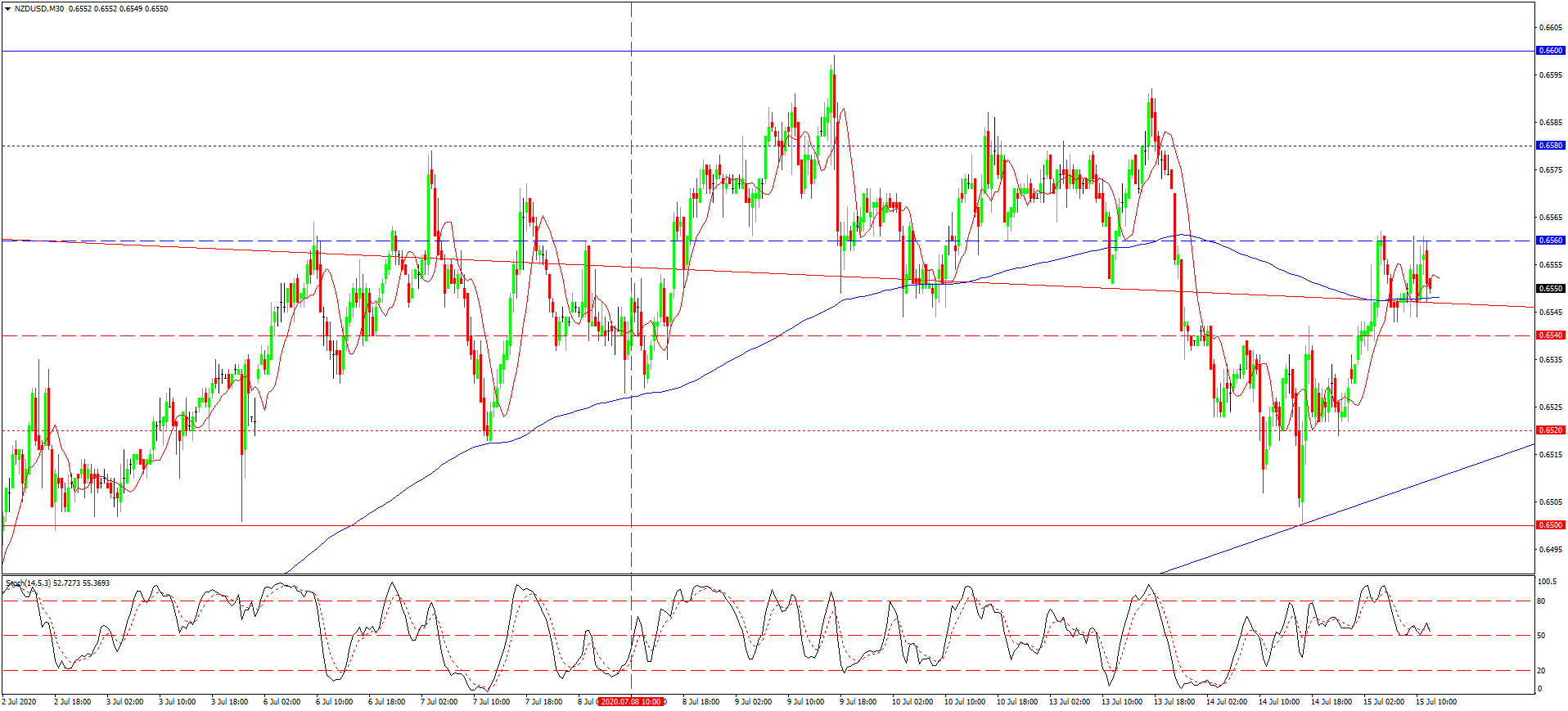 از دفعه قبل به تاریخ 8 ژوئیه که در مورد این جفت ارزی نوشته بودیم، قیمت به افزایش کلی ادامه داد. ماکسیموم 0.6580 را شکاند و راهی سطح هیجانی 0.6600 شد. تست این سطح مسلما به افت بعدی انجامید. سپس قیمت دوباره به زیر ماکسیموم تاریخی 0.6580 برگشت و حتی مرز پایینی کانال 0.6600-0.6540 را هم شکاند. این امر سیگنال خوبی برای ادامه دادن به فروشی بود، که دقیقا تا مرز خط روند صعودی ادامه پیدا کرد. یعنی تا مرز سطح هیجانی 0.6500. این سطح هیجانی مینیموم موضعی نیز به حساب می آید و مسلما برخورد با این سطح انعکاس را به دنبال داشت. قیمت فعلا در حال افزایش است و با توجه به احتمال افت بیشتر دلار ایالات متحده، می توان با ادامه یابی روند صعودی این جفت ارزی تا مرز 0.6600 هم رو به رو شد، که البته بعد از شکست ماکسیموم موضعی 0.6560 امکان پذیر است.