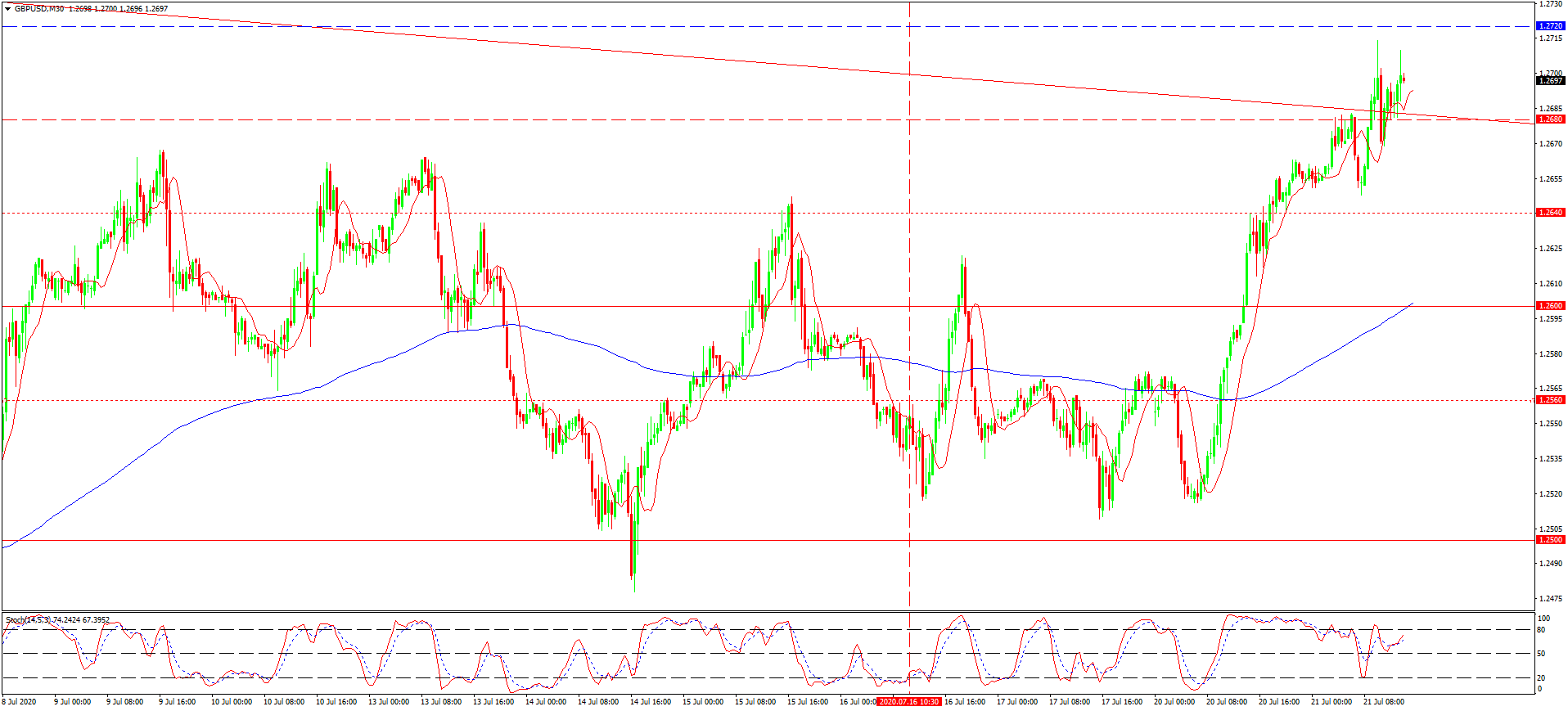 از دفعه قبل که در مورد پوند نوشته بودیم، قیمت داشت به مینیموم 1.2500-1.2480 نزدیک می شد. نرسیده به این بازه، گرایش انعکاس پیدا کرد. سه باز انعکاس گرایش از سطح 1.2500 اهمیت بالای این سطح را نشان می دهد، که در آخر هم باعث ادامه یابی افزایش قیمت پوند شد. اخیرا قیمت، ماکسیموم موضعی 1.2640 را شکاند و حتی به سطوح هدفی 1.2680 و 1.2700 رسید. ولی فشردگی نوسانی که در حال حاضر مشاهده می کنیم مشکوک است. در واقع قیمت به خط روندی نزدیک شده، که از اواخر 2019 ادامه داشته و مانع افزایش قیمت در طول نیم سال اخیر می شده. به خاطر قوه زیاد این مقاومت، معاملات خرید پوند را به بعد از شکست مقاومت 1.2720 موکول می کنیم. افزایش آتی می تواند تا مرز 1.2800 نیز ادامه پیدا کند. به منظور بروز این افزایش می بایست تا بازگشایی جلسات معاملاتی آمریکا صبر نمود.