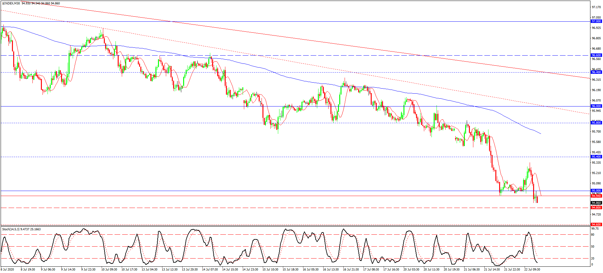 قیمت دلار درحال حاضر به نهاد بازار و مینیموم تاریخی 94.60 نزدیک شده. البته تا قبل از شکست سطح هدفی 94.80 امکان افت بیشتر وجود ندارد و با توجه به انعکاس فعلی قیمت بر فراز این سطح، حتی امکان دارد تا انعکاس قیمت و افزایش بعدی به زودی اتفاق بی افتد و در میان مدت هم ادامه دار شود. پتانسیل افزایشی دلار فقط تا قبل از شکست 94.80 اهمیت دارد و می تواند تا مرز خطوط روند نزولی و مقاومت های 95.40 و یا 95.80 هم ادامه پیدا کند. چنین افزایشی از نظر تکنیکی امکان پذیره و داده های فاندامنتال هم احتمال چنین افزایشی را بیشتر می کنند. البته این افزایش و انعکاس گرایشی می تواند بعد از شکست ضربانی 94.80 و افتی سریع تا مرز 94.20 یا 94.00 هم رخ دهد.