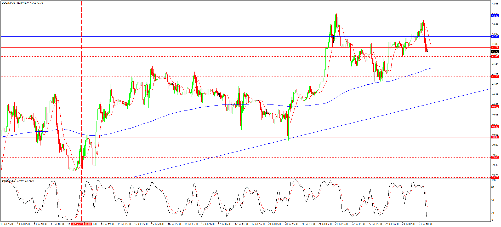 از دفعه قبل که در مورد این دارایی نوشته بودیم، قیمت داشت به خط روند بلند مدت، که از اواخر ماه می ادامه دارد، نزدیک می شد. مسلما برخورد با چنین خط بالقوه ای انعکاس گرایشی در محدوده سطح هیجانی 40.00 دلار را، به دنبال داشت. افزایش دوباره از این سطح تا ماکسیموم جدید و سطح هدفی بعدی که 42.00 دلار بود، ادامه یافت. این سطح را دوباره تست کرد و در حال حاضر قیمت در حال پایین آمدن از راس بازار می باشد. محدوده نرخی که در آینده می تواند به این افت اتمام دهد شامل سطوح 41.60 و 41.20 می باشد.
