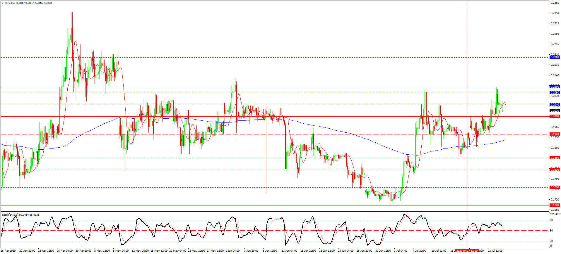 از دفعه قبل که در مورد این ارز دیجیتال نوشته بودیم، قیمت پشتیبانی هدفی 0.1860 را تست کرده بود و راهی راس بازار بود. این پشتیبانی در وسط ضربان نرخی دوم تا دهم ماه جاری قرار داشت و آزمایش شدن آن، به افزایش دوباره انجامید. با وجود اینکه روند اخیرا ایجاد شده دارای شیب شدیدی بود. روند صعودی سطح هیجانی 0.2000 را شکاند و تا ماکسیموم 0.2080 افزایش یافت. افتی که الان مشاهده می کنیم قیمت را به سطح هیجانی یاد شده دوباره نزدیک کرده. احتمال شکست این سطح و افت آتی چندان امکان پذیر به نظر نمی رسد. به هر حال بازه ریسک خرید را بهتر است از سطح 0.1940 پایین تر نبریم.