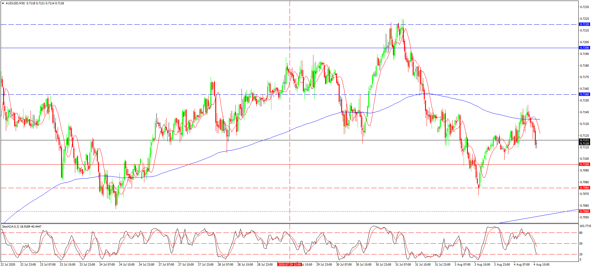از دفعه قبل که در رابطه با این جفت ارزی نوشته بودیم، قیمت دلار استرالیا افتی اصلاحی را تجربه می کرد. این افت بعد از مدتی به فشردگی نرخی در چهارچوب کانال افقی 0.7160-0.7180 تبدیل شد. شکست مابعد پشتیبانی موضعی به برخورد قیمت با سطح هدفی بعدی – 0.7120 منجر شد. این افت دقیقا هم اندازه وسعت کانال بود. افت کلی دلار ادامه دار شد و قیمت به هر حال به ماکسیموم 0.7220 رسید. اخیرا قیمت دوباره به پشتیبانی تاریخی 0.7080-0.7060 نزدیک شد ولی نرسیده به کف این بازه دوباره استحکام یافت. افتی که هم اکنون می بینیم اصلاحی است و می تواند تا مرز 0.7100 ادامه یابد. از نظر کلی می توان با افزایش دوباره بعد از برخورد با سطح یاد شده رو به رو شد.