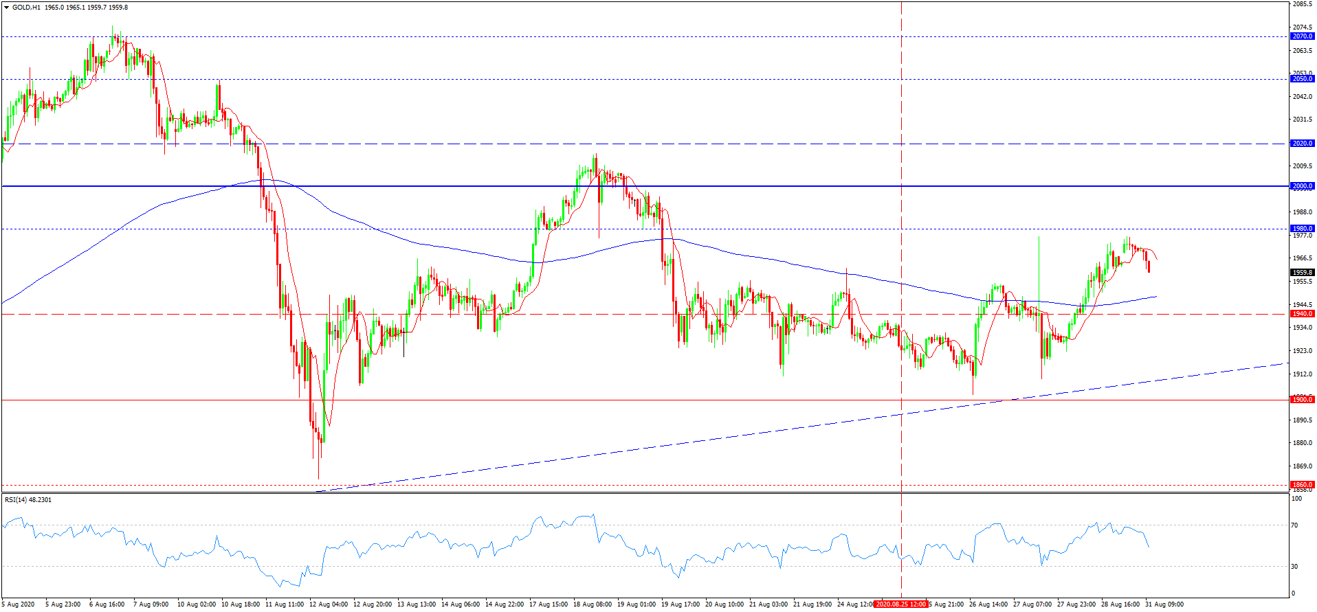 از دفعه قبل که در مورد قیمت طلا نوشته بودیم، قیمت به مینیموم موضعی و پشتیبانی خط روند صعودی نزدیک می شد. مسلما پتانسیل نزولی قیمت را تا مینیموم موضعی و سطح هیجانی 1900 سوق داد. برخورد با این سطح هیجانی و نزدیکی به پشتیبانی خط روند صعودی که از اواخر ماه مارچ ادامه یافته، منجر به انعکاس یابی گرایش نزولی شد. افزایش اولیه مسلما تا ماکسیموم موضعی 1950 ادامه یافت. سپس، بعد از افتی اصلاحی ماکسیموم شکسته شد و افزایش قیمت تا سطح هدفی 1980 ادامه یافت. افت فعلی قیمت اصلاحی می باشد و مستقیما به آمار اقتصادی مثبت چین و افزایش قیمت نفت مربوط می شود. این افت می تواند تا مرز 1950 و یا 1920 هم ادامه یابد. عدم افزایش دوباره بعد از برخورد با این دو پشتیبانی مبنی بر بسته شدن معاملات خرید در میان مدت خواهد بود.
