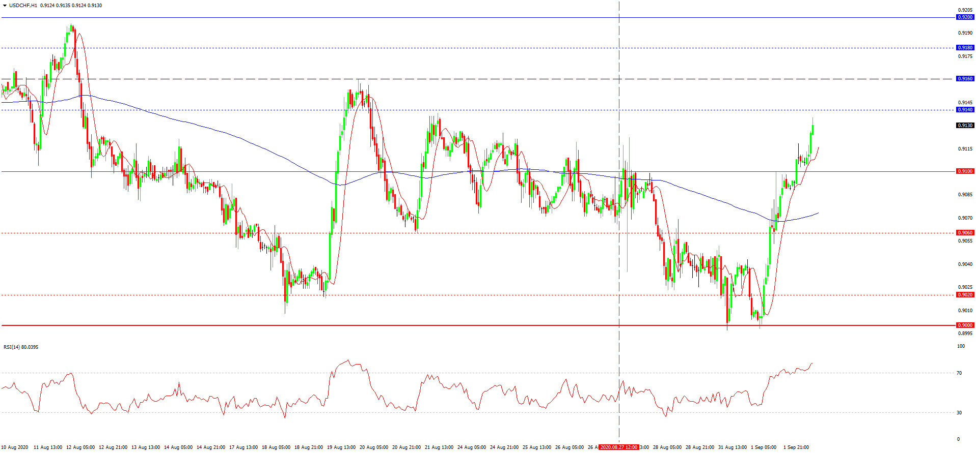 از دفعه قبل که در رابطه با این جفت ارزی نوشته بودیم، فشردگی نوسانات نرخی با شیبی نزولی و کاهش مداوم ماکسیموم ها، شکست مینیموم 0.9080 و 0.9060 را به دنبال داشت. همین امر باعث شد تا قیمت تا سطح هدفی 0.9020 و سطح هیجانی 0.9000 کاهش پیدا کند. مسلما برخورد با این سطح هیجانی باعث اتمام گرایش نزولی و انعکاس مابعد شد. افزایش تا مرز 0.9100 ادامه یافت و در حال حاضر قیمت به سطح 0.9140 نزدیک می شود. در صورت برگشت قیمت از این سطح می توان با از سر گیری گرایش نزولی رو به رو شد. شکست سطح 0.9160 نیز نمی تواند عامل از سر گیری گرایش صعودی در بلند مدت به حساب آید و به احتمال زیاد برخورد قیمت با این سطح از سر گیری روند نزولی را به دنبال خواهد داشت.