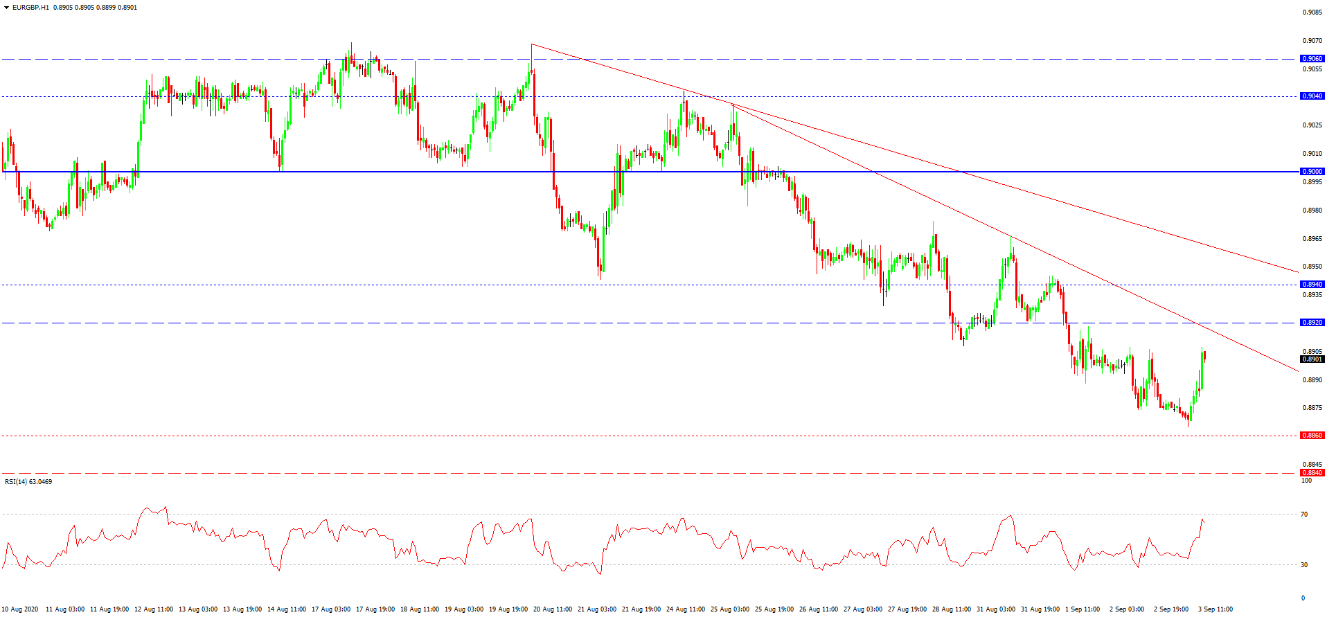 جفت ارزی یورو- پوند روند نزولی خود را به موازات اصابت با پشتیبانی 0.8860 متوقف نمود. به موازات این پشتیبانی در تاریخ معاملات با عبور چندی از مینیموم های تاریخی رو به رو ایم. دلیل انعکاس قیمت و از سر گیری افزایش نرخی یورو نیز، همین است. افزایش اصلاحی که الان مشاهده می کنیم می تواند تا مرز 0.8920 ادامه یابد. فشرده شدن نوسانات در این محدوده می تواند با انعکاس بعدی همراه گردد. در صورت ادامه یابی افزایش ضربانی می توان با شکست مقاومت و افزایش تا 0.8940 نیز رو به رو شد. چنین روندی می تواند قیمت را به خط روند نزولی 20 آگوست نزدیک کند.