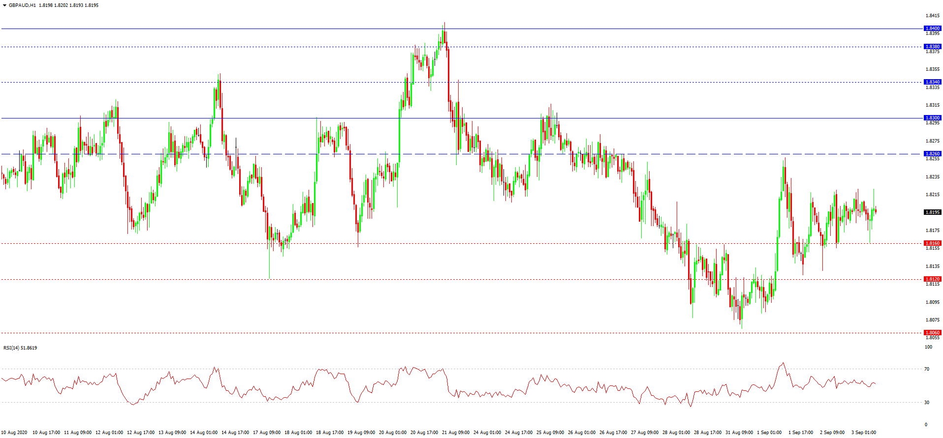 این جفت ارزی از نظر کلی دچار فشردگی نوسانی است، ولی اخیرا با روند ملایم از نهاد بازار انعکاس یافته. افتی که در حال حاضر رخ داده، می تواند تا مرز 1.8160 و یا 1.8120 هم ادامه یابد. انعکاس دوباره از آخرین پشتیبانی و یا تشکیل یابی الگو های انعکاسی و یا اکستریم های کندلی در حوالی آن، سیگنال خوبی برای از سر گیری معاملات خرید می باشد. چنین انعکاسی می تواند به افزایش دوباره تا مرز 1.8200 بی انجامد. ورود قیمت به بازه نرخی 1.8240-1.8260 مبنی بر تقویت خریداران و احتمال افزایش ضربانی تا 1.8300 خواهد بود. البته در صورتی که این روند با شیبی بسیار تند ایجاد شود.