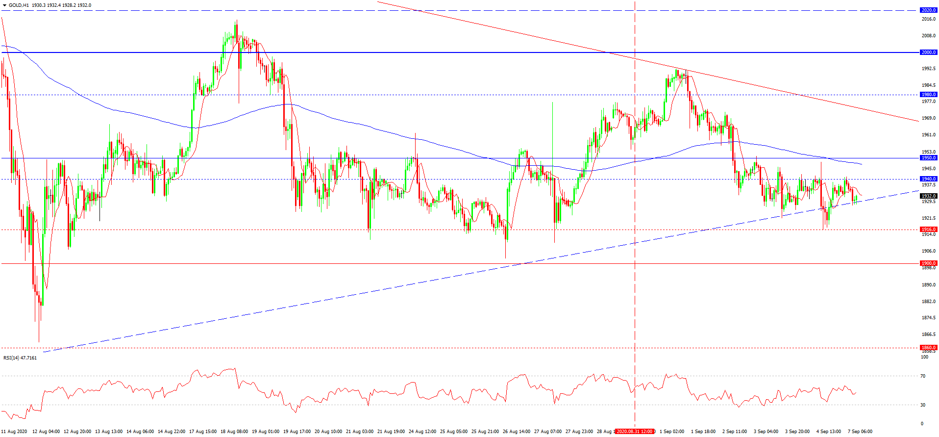 از دفعه قبل که در مورد طلا نوشته بودیم، قیمت این دارایی به افزایش کلی ادامه داد و تا بازه مقاومت 1980-1990 ارتقا یافت. سپس با افت قیمت نرسیده به سطح هیجانی 2000 دلار رو به رو شدیم. افت تا خط روندی که از اواخر مارچ ادامه داشته، ادامه یافت. برخورد با این خط، همانطور که در درس ها بیان نموده بودیم، به تست شدت مینیمو موضعی – 1916 انجامید. قیمت در حال حاضر دچار فشردگی نوسانی شده است ولی الگویی را که در نهاد بازار رسم کرده، شبیه به الگوی انعکاسی سر و شانه است. مسلما در صورت شکست ماکسیموم 1940-1950 قیمت می تواند تا مرز خط روند نزولی و سطوح 1960-1980 هم افزایش یابد. چنین روندی به افت سهام ایالات متحده، بر اثر وخیم شدن شرایط چالش تجاری و یا از سر گیری موج دوم ویروس در ایالات متحده و یا افزایش تعداد مبطلایان بستگی خواهد داشت.