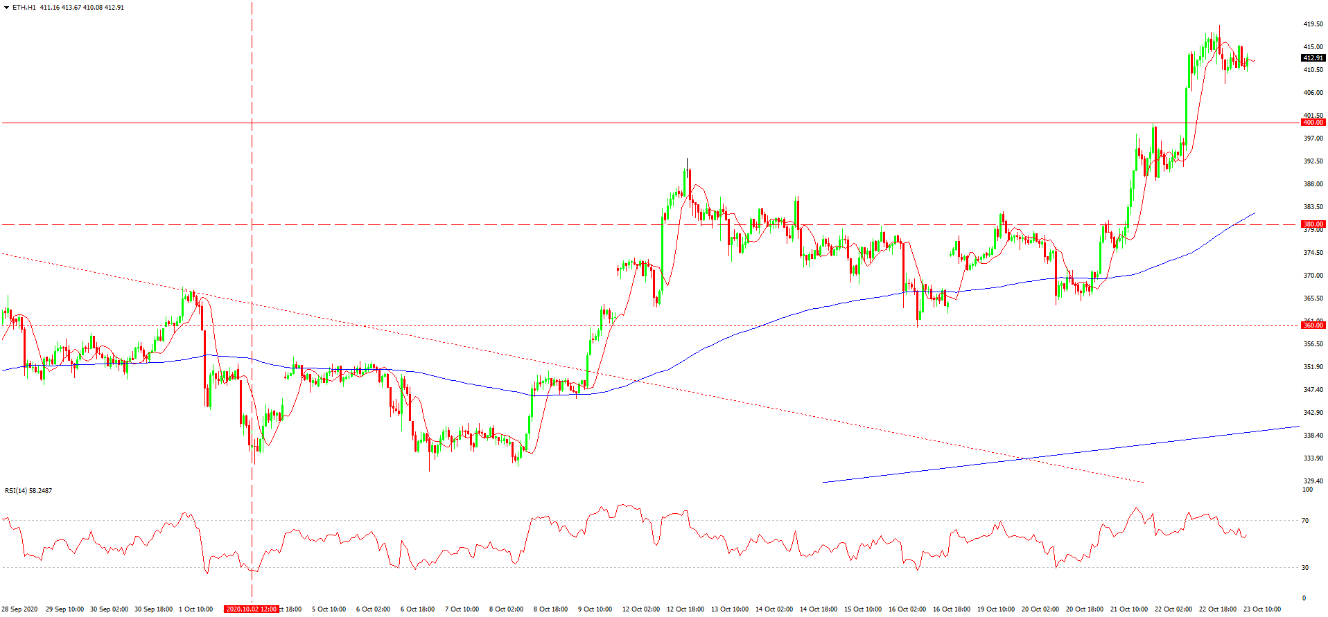 از دفعه گذشته به تاریخ 2 اکتبر که در مورد اتریوم نوشته بودیم، قیمت کاهش را تا مرز 330 دلار ادامه داد. اما برگشت دوباره و تحکیم یابی بر فراز خط روند نزولی از سر گیری افزایش تا ماکسیموم موضعی 400 دلار و حتی 420 را نیز به دنبال داشت. روند صعودی در نمودار رمزارز ها با شکست ماکسیموم ها همراه بوده و در حال حاضر هم با سیگنال افت اصلاحی مواجه نیستیم. احتمال ادامه یابی افزایش آتی اتریوم تا مرز 440 و یا 460 نیز وجود دارد.