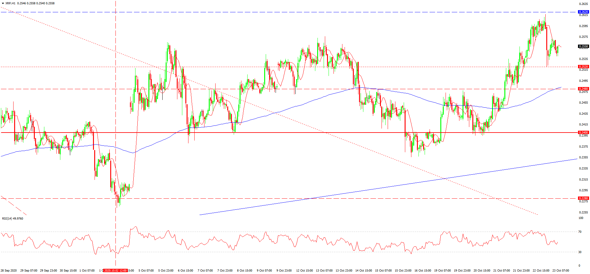 ریپل هم خط روند نزولی را شکاند و ماکسیموم موضعی 0.2500 را رد کرده. روند نزولی که الان ایجاد شده ضربانی بوده و از ثبات برخوردار نیست. احتمالا می توان با ادامه یابی افزایش این رمزارز تا مرز 0.2660 و حتی 0.2700 نیز رو به رو شد. این افزایش تا قبل از شکست پشتیبانی 0.2480 می تواند ادامه داشته باشد.