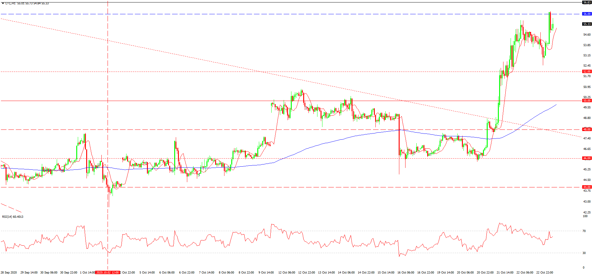 پتانسیل صعودی لایتکوین هم هنوز به اتمام نرسیده. شاید افت اصلاحی برای ترساندن خریداران رخ دهد، اما پتانسیل صعودی تا سطوح 58.00 و 60.00 دلار می باشد. این افزایش شاید بعد از برخورد با سطوح 60.00 یا 62.00 اتمام یابد.