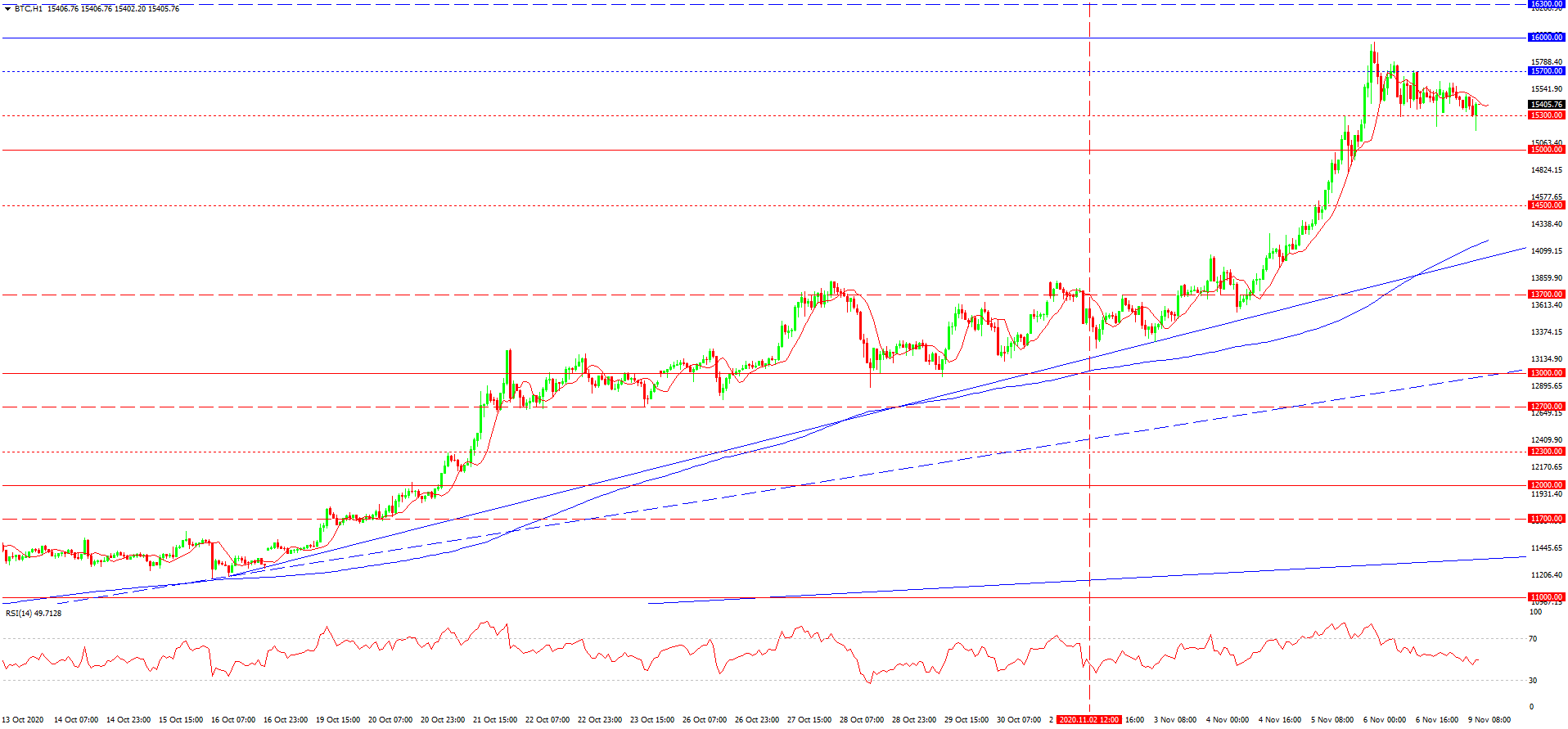 قیمت بیتکوین از دفعه گذشته به تاریخ 2 نوامبر دچار فشردگی نوسانی به سمت ماکسیموم 13700 شده بود و این سناریو پس از افتی کوتاه تا 13500، با ادامه یابی روند صعودی تا مرز 16000 دلارهمراه گردید. افت کنونی قیمت اصلاحی می باشد. البته روند نزولی با نوسانات فشرده برای چشم انداز میان مدت منفی است. در نظر داشته باشید که عدم ایجاد فراکتال موضعی در محدوده 15000، می تواند مبنی بر ادامه یابی روند نزولی در میان مدت باشد.