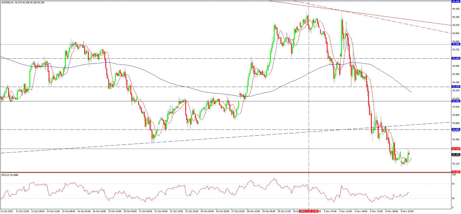 شاخص دلار از دفعه گذشت به تاریخ 2 نوامبر به سطح هدفی 94.00 نزدیک شده بود. در همین حین احتمال برد ترامپ پایین بود و پافشاری سنا برای تصویب لایحه مالی هم آشکار شده بود. مسلما دلار روند نزولی را از سر گرفت.این افت در حال حاضر قیمت را دوباره به خط روند صعودی چند ساله در محدوده 92.00 برگشته. در کوتاه مدت شاید با افزایش اصلاحی قیمت دلار تا مرز 92.60 نیز رو به رو شویم. ادامه یابی روند اقفی هم امکان پذیر است، البته در صورت افت ناگهانی یورو و یا پوند.
