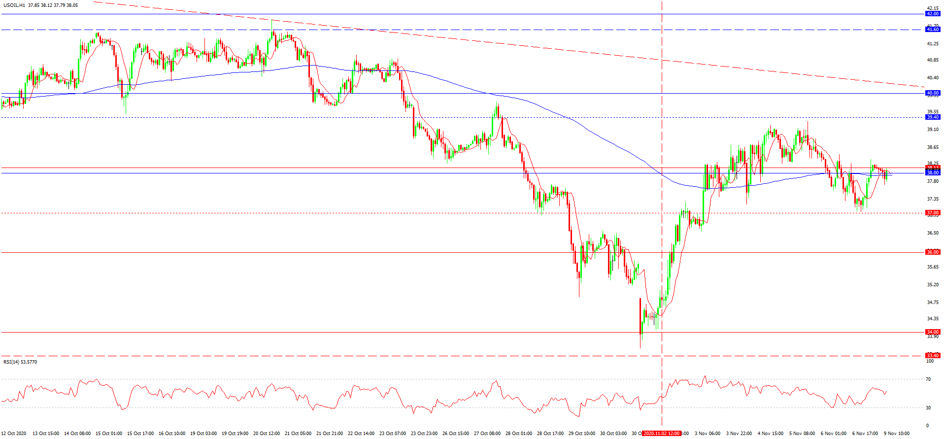 قیمت این دارایی از دفعه گذشته افت شدیدی را تجربه کرد و بر اثر ترس از قرنطینه در ایالات متحده تا مرز 34 دلار نیز سقوط نمود. افزایش دوباره از سر گرفته شد و قیمت را بر فراز 38 دلار برده تا مرز 39.20 نیز ارتقا داد. افتی که اخیرا دیدیم همراه با رد شدن ترامپ در طی انتخابات ریاست جمهوری آمریکا رخ داد که البته ادامه دار خواهد بود. افتی که قیمت نفت را در صورت سقوط آتی پایین تر از 38 دلار می تواند تا مرز 36 و یا 35 دلار نیز کاهش دهد.