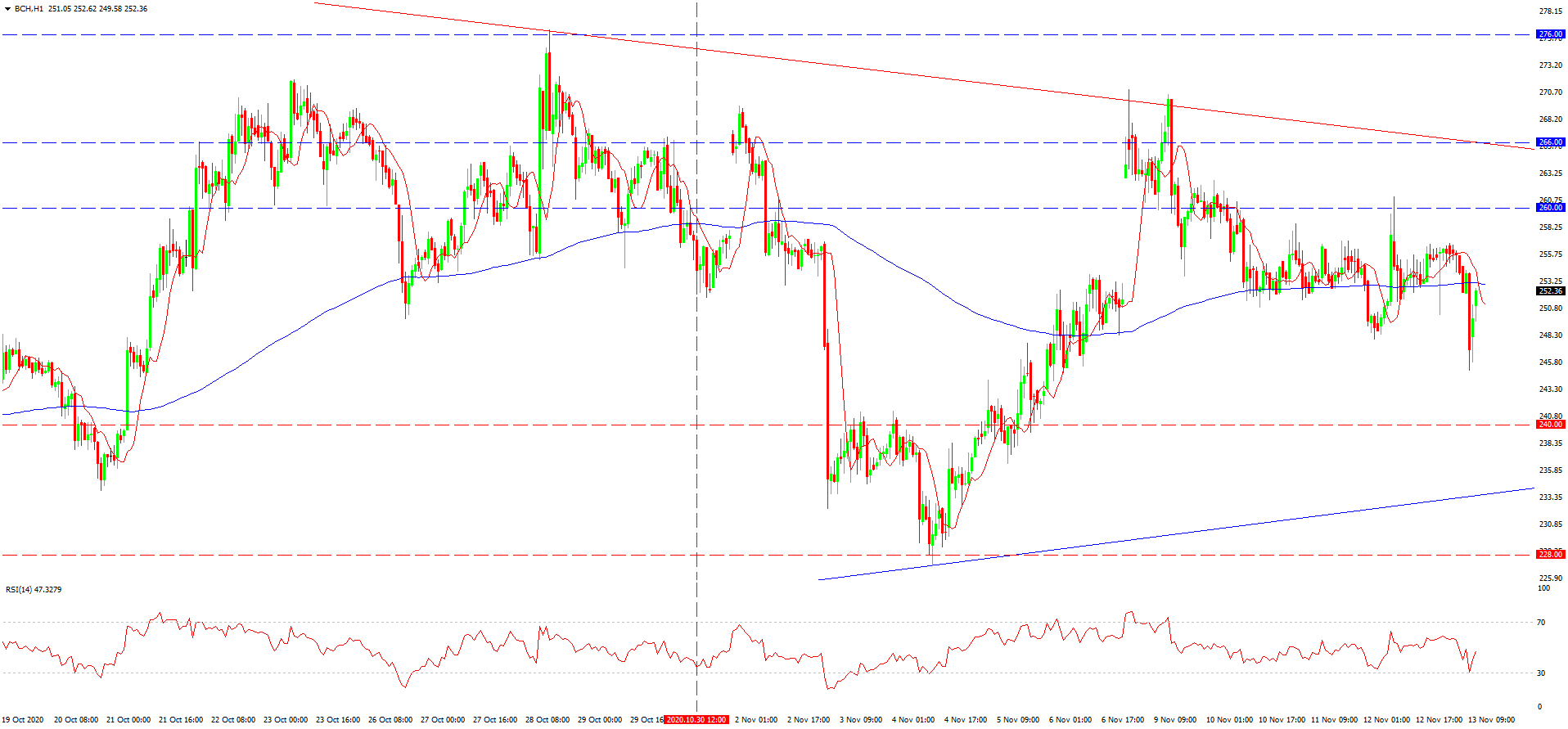 از دفعه گذشته به تاریخ 30 اکتبر که در مورد این رمزارز نوشته بودیم، قیمت آن از ماکسیموم 276 انعکاس پیدا کرده بود و بعد از تست دوباره آن راهی نهاد بازار شد. نرخ گذاری ها تا مینیموم 240 و یا دقیق تر 228 افت نمودند. خط روند صعودی از کاهش بیشتر جلوگیری نمود و قیمت به روند بلند مدت و صعودی برگشت. افزایش اخیر دوباره قیمت را به ماکسیموم یاد شده نزدیک کرد، اما از این ماکسیموم با افتی دوباره رو به رو شدیم. این افت موقت بوده و به احتمال زیاد نرسیده به نهاد بازار و مینیموم 240 اتمام خواهد یافت. افزایش آتی بعد از انعکاس گرایشی از نیمه بازار (یا همان نیمه ضربان قبلی)، می تواند شکست ماکسیموم 276 و افزایش بیشتر تا مرز 300 یا حتی 320 دلار را نیز به دنبال داشته باشد.