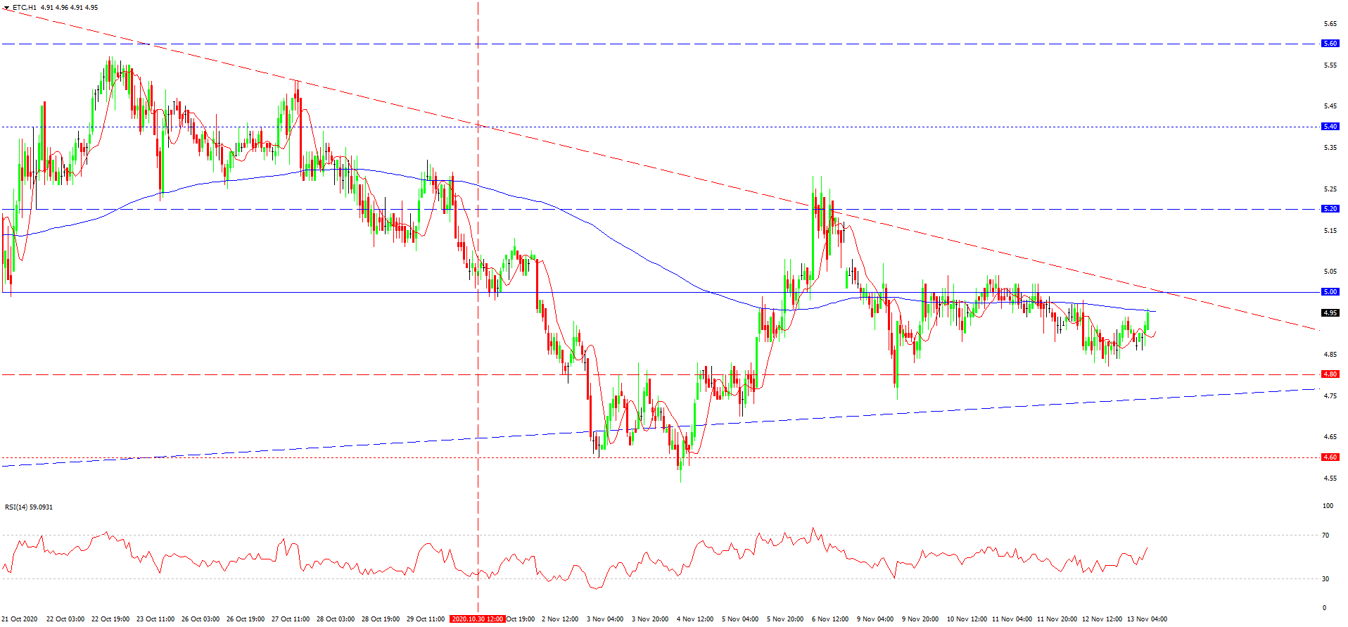 این رمزارز نیز از دفعه گذشته دچار افت شدیدی شد که البته قیمت را تنها تا خط روند صعودی بلند مدت سوق داد. شکست سطح 5.00 قیمت را تا 4.80 و 4.60 کاهش داد و سپس همراه با برخورد قیمت با خط روند، با انعکاس و برگشت قیمت به روند اصلی رو به رو شدیم. در حال حاضر نیز دوباره با فشردگی نوسانی در حوالی این خط روند رو به رو هستیم که احتمالا با از سر گیری افزایش، شکست مقاومت 5 و افزایش بیشتر تا ماکسیموم 5.20 همراه خواهد گردید. احتمالا این افزایش در آینده قیمت را تا مرز 5.40 و یا 5.60 نیز ارتقا خواهد داد.