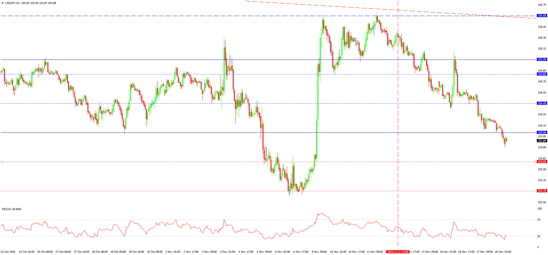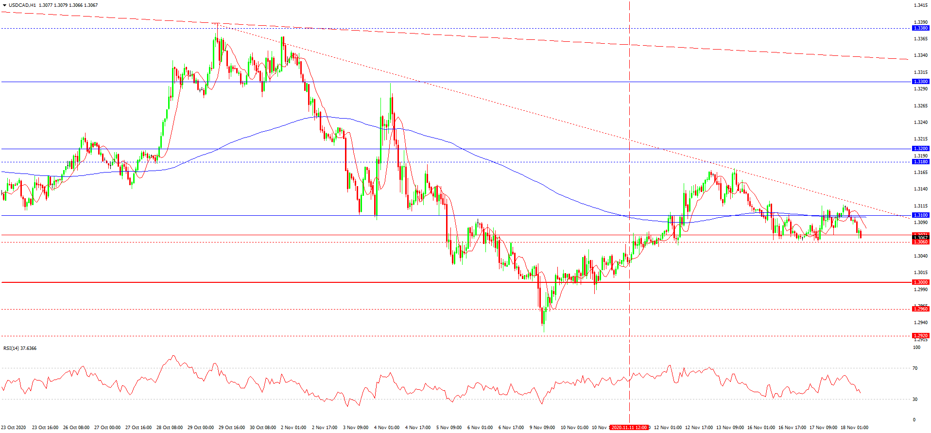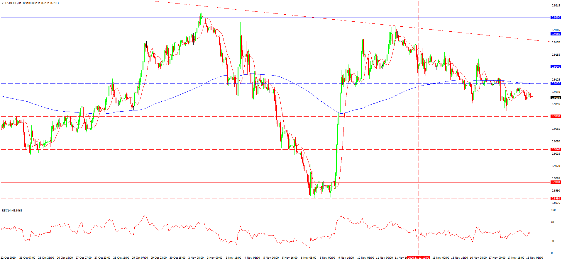 این جفت ارزی به تاریخ 11 نوامبر نرسیده به ماکسیموم 0.9200 و در حوالی مقاومت هدفی 0.9180 انعکاس پیدا کرده بود، که مبنی بر از سر گیری افت نرخ گذاری ها بود. افت قیمت دلار ایالات متحده نرخ گذاری های این جفت ارزی را تا مرز 0.9120 و سپس تا 0.9080 نیز سوق داد. قیمت دلار نسبت به دارایی های حفاظتی فعلا افزایش نمیابد و تنها عوامل از سر گیری رشد قیمت دلار هم با نزدیکی قرنطینه و تصویب محرک مالی بعدی، از میان برداشته شده اند. به همین دلیل افت بیشتر شاخص دلار و شکست آتی خط روند چند ساله این نمودار می تواند سیگنال خوبی به منظور اجرای معاملات فروش این جفت ارزی باشد. افتی که شاید بتواند تا مرز 0.9040 و یا حتی 0.9000 نیز ادامه یابد.