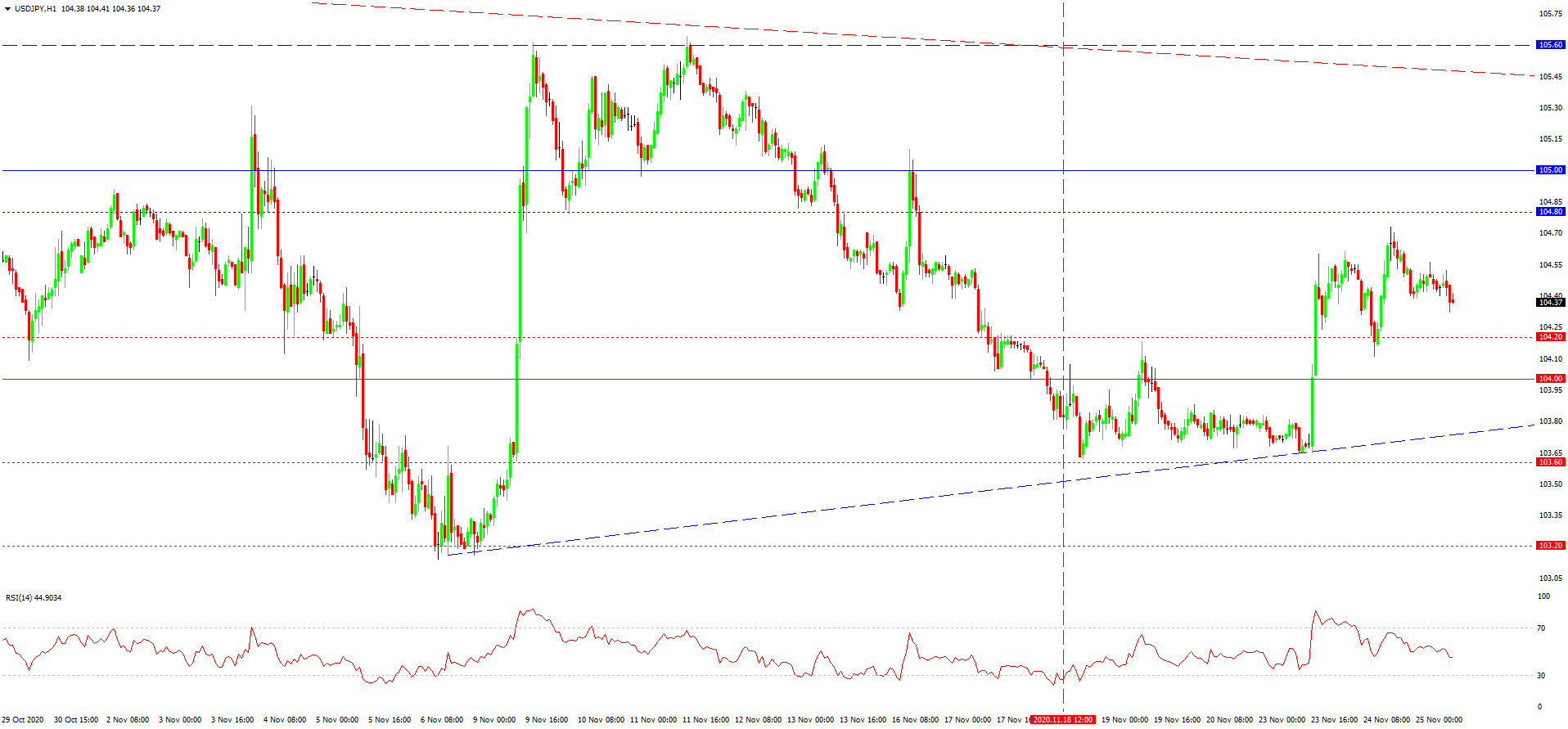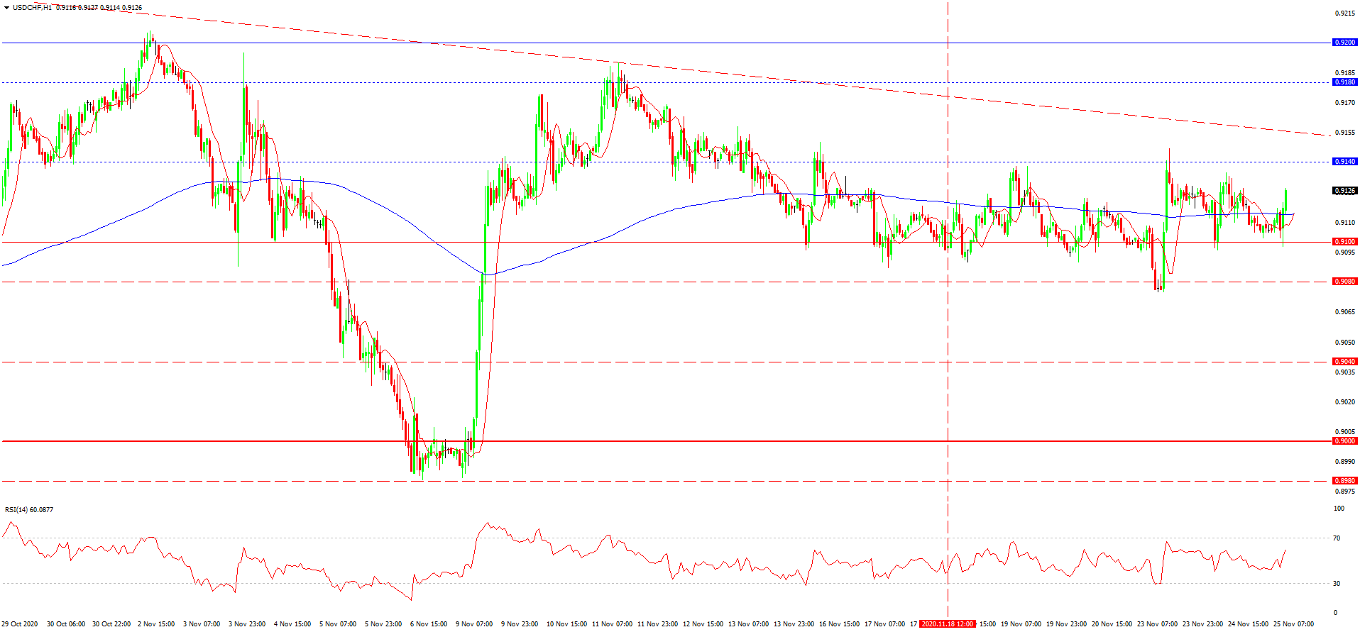 از دفعه گذشته که در مورد این جفت ارزی به تاریخ 18 نوامبر نوشته بودیم، نرخ گذاری ها بعد از تست پشتیبانی 0.9100 اصلاح شده بودند. افزایش موقت تا مرز 0.9140 ادامه یافت. سپس با فشردگی دوباره نوسانات رو به رو شدیم. فشردگی که به دلیل افت هم زمان طلا و دلار رخ داد. احتمالا طلا در حال انعکاس یابی از نهاد بازار است و شاید دلار به افت خودش در آینده پایین مینیموم ها ادامه دهد. این سناریو با در نظر گیری حظور نرخ گذاری ها در نزدیکی خط روند نزولی می تواند مبنی بر از سر گیری روند نزولی این جفت ارزی در آینده نزدیک و افت نرخ گذاری های دلار/فرانک تا سطوح 0.9080، 0.9040 و یا سطح هیجانی 0.9000 باشد. چنین افت سریعی مسلما فلا غیر ممکن است و احتمالا نیمه این پتانسیل تا قبل از تصویب لایحه محرک مالی سنا آمریکا، طی خواهد شد.