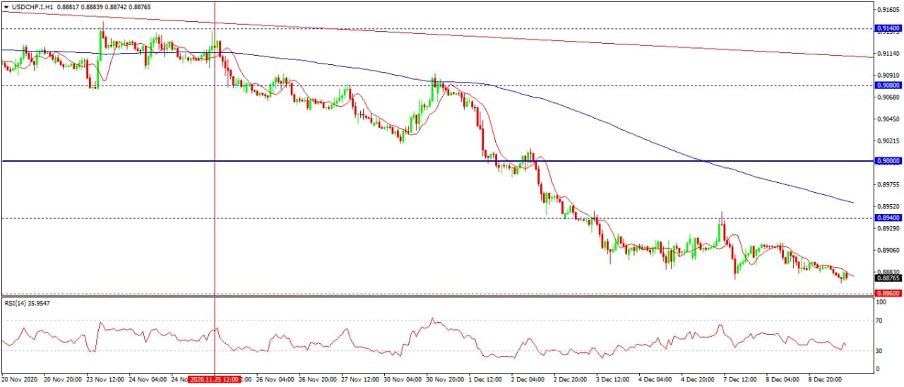 از دفعه گذشته به تاریخ 25 نوامبر که در مورد این جفت ارزی نوشته بودیم، نرخ گذاری ها راهی مینیموم 0.9080 بودند و افت دلار به موازات توقف یابی روند نزولی طلا به سناریو نزولی این جفت ارزی دامن زد. مینیموم شکسته د و نرخ گذاری ها تا مرز 0.8880 افت نمودند. در حال حاضر با فشردگی قیمت به این سطح رو به رو می باشیم. افت آتی به شکل ضربانی میتواند ادامه یابد اما سریعا گرایش را انعکاس داده و افزایش از سر گرفته شود.