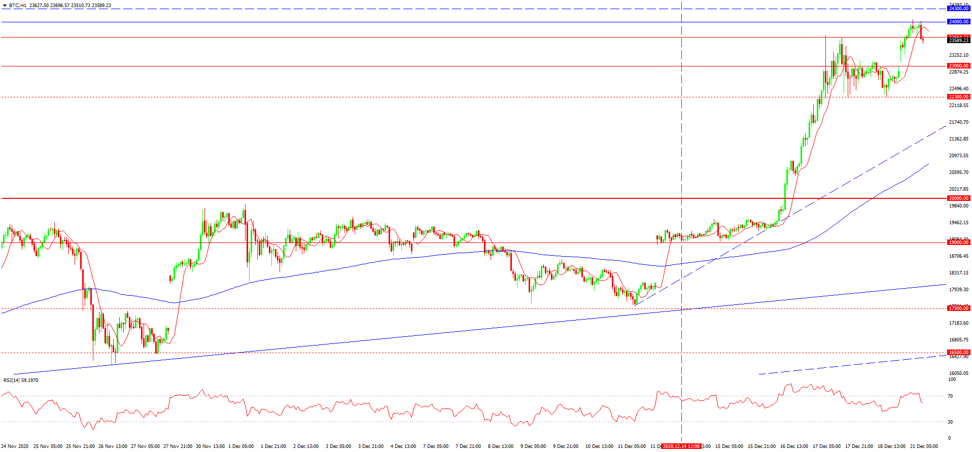 از دفعه گذشته به تاریخ 14 دسامبر که در مورد بیتکوین نوشته بودیم قیمت این رمزارز به ماکسیموم تاریخی 20000 فشرده شده بود و ما در انتظار شکست این مقاومت بودیم. مقاومت شکسته شد و قیمت تا مرز 24000 دلار افزایش یافت. احتمال ادامه یابی افزایش بیشتر تا مرز 25000، 27000 و یا 30000 دلار نیز بعید به نظر نمی رسد. البته در صورتی که فعلا با موج های فروش و ترس در بازار دارایی های ریسکی مثل طلا رو به رو نشویم. پتانسیل افت اصلاحی تا مرز 22300 به حساب می آید. افت بیشتر می تواند مبنی بر فشردگی نوسانی در میان مدت باشد، که امکان خریداری را از ما می گیرید. البته فعلا طلا به افزایش خود ادامه می دهد، موج ویروس جهش یافته در حال گسترش است وتوضیع واکسن کرونا فعلا در چند ایالات آمریکا ایست پیدا کرده.
