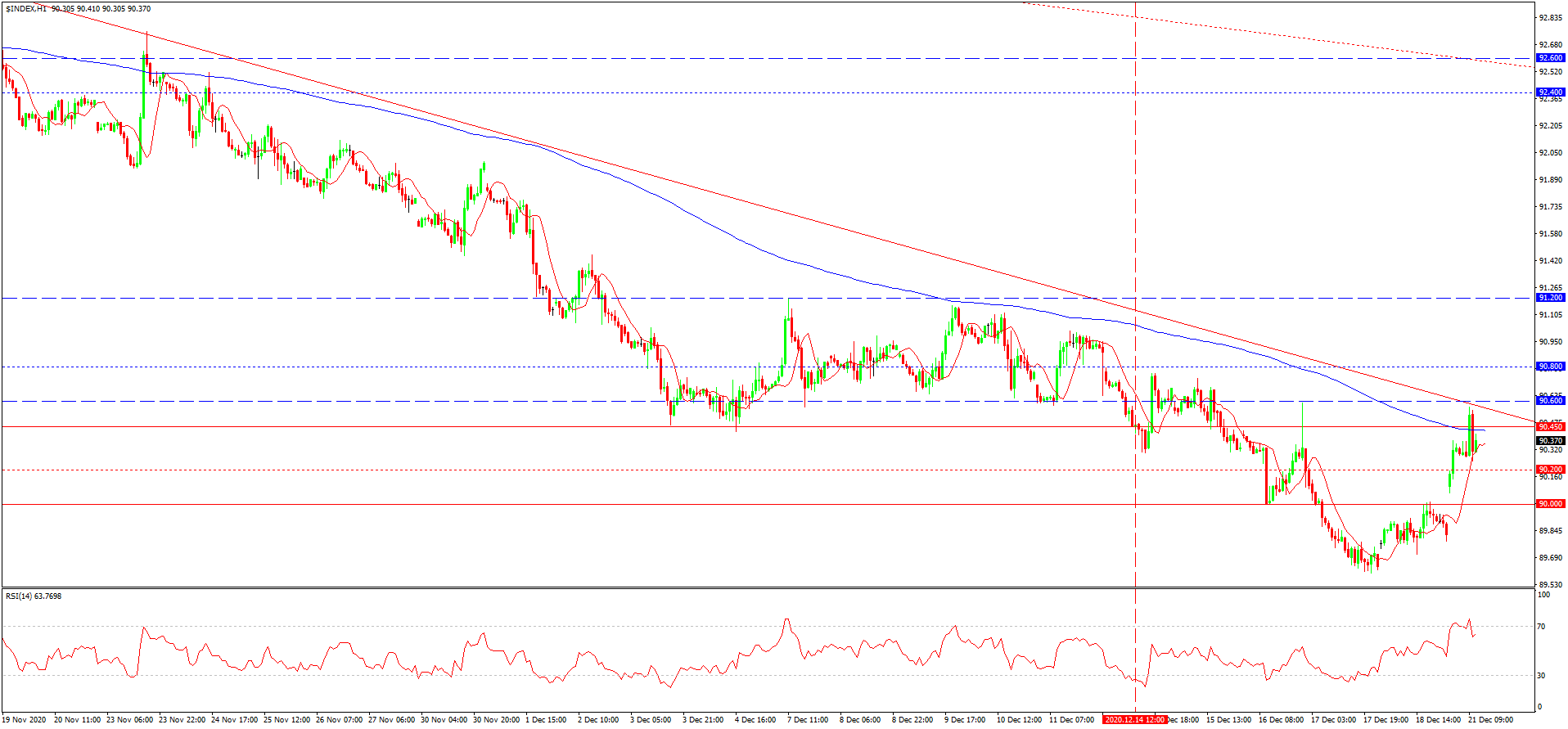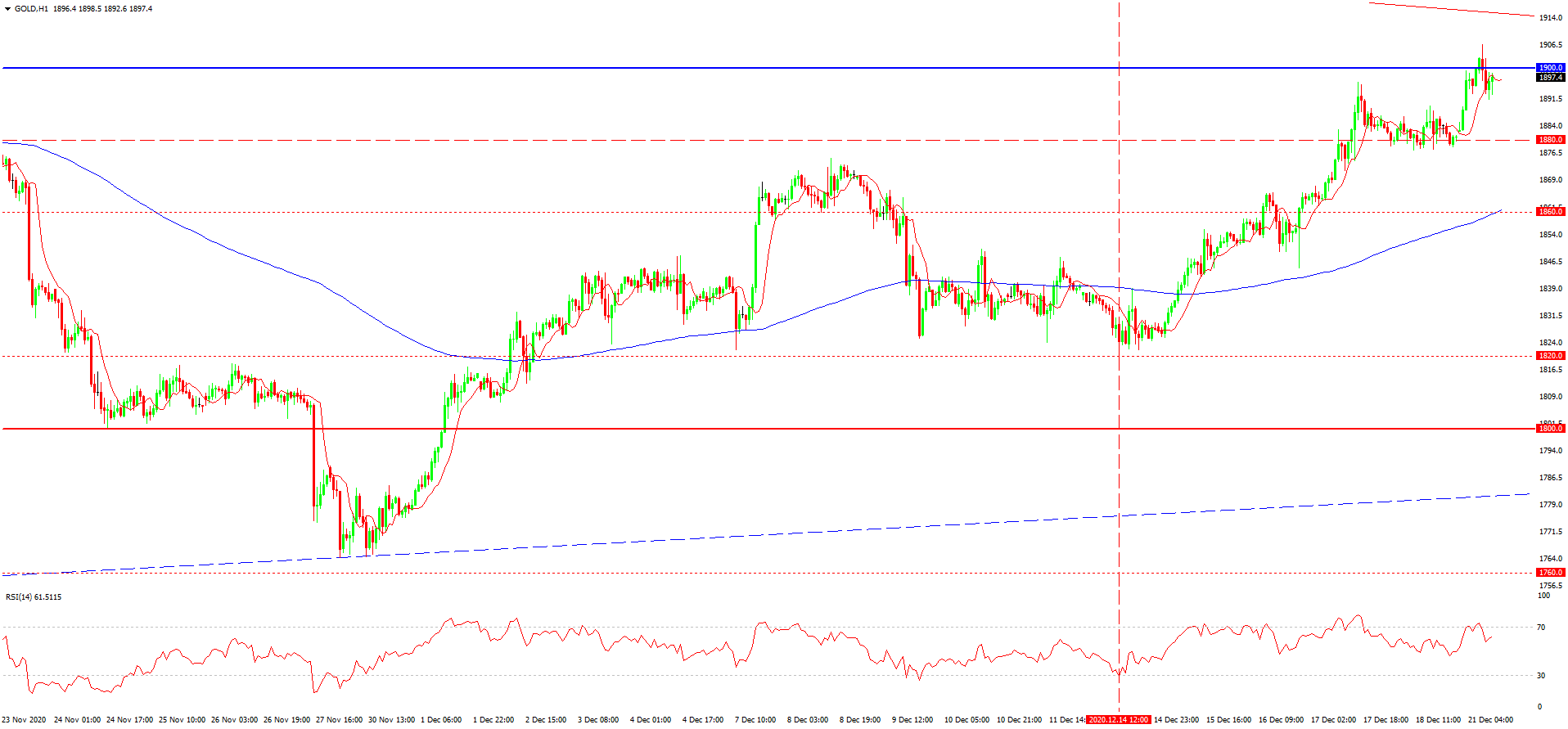 از دفعه گذشته به تاریخ 14 دسامبر که در مورد طلا نوشته بودیم، قیمت بر فراز پشتیبانی 1820 استحکام یافته بود. افزایش دوباره همراه با افزایش قیمت بیتکوین از سر گرفته شد و تا مرز 1900 نیز ادامه یافت. احتمال وخیم تر شدن شرایط شیوع ویروس و جهش آن حتی با وجود کشف و توضیع واکسن به عنوان عوامل اصلی این افزایش قیمت دارایی های حفاظتی به حساب می آیند، که پیش تر در رابطه با احتمال افزایش آنها خبر داده بودیم. قیمت طلا در حال نزدیک شدن به خط روند نزولی است. در صورتی که اخبار مثبت در مورد کاهش تعداد مبتلایان و توضیع سریع تر واکسن در ایالات متحده رسانه ها را پر نکند، می توان با ادامه یابی افزایش قیمت طلا بعد از شکست این ماکسیموم تا مرز 1940 و یا حتی 1960 نیز رو به رو شد.