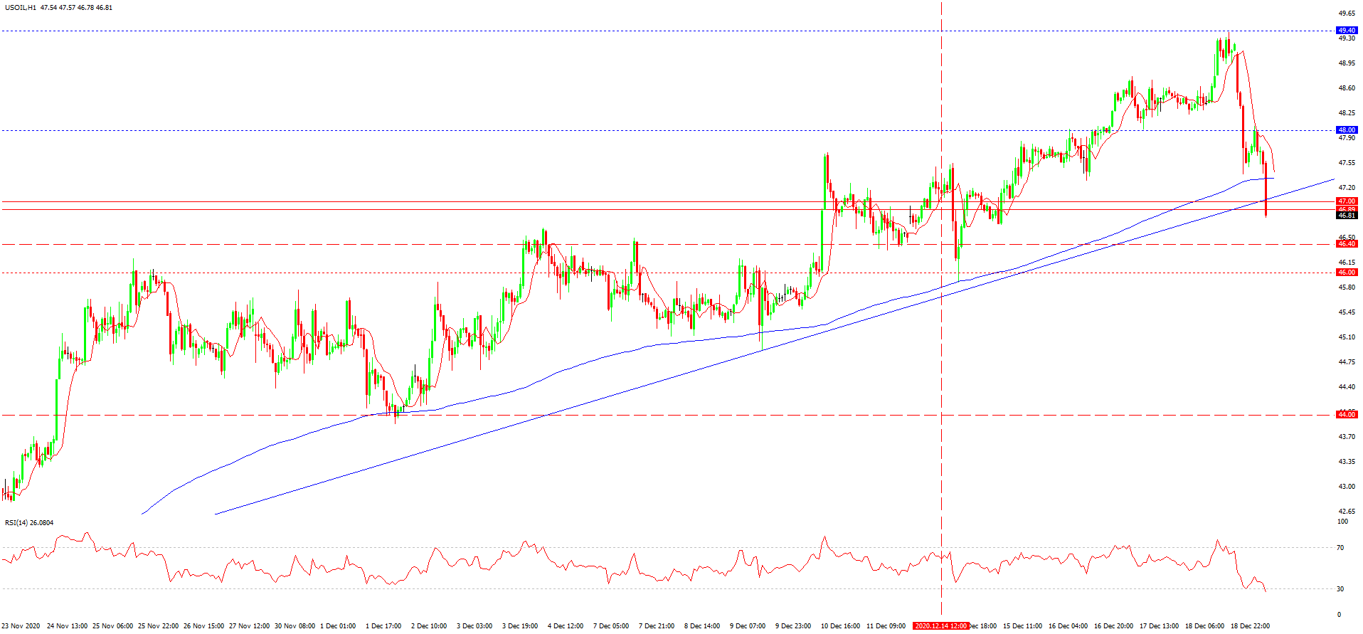 از دفعه گذشته که در مورد قیمت نفت نوشته بودیم، نرخ گذاری ها به ماکسیموم 48.00 دلار فشرده شده بودند و افزایش مابعد، بعد از شکست این ماکسیموم تا مرز 49.40 نیز ادامه یافت. افت اخیر قیمت نفت نرسیده به سطح 50.00 دلار می تواند مبنی بر از سر گیری روند نزولی در میان مدت باشد. احتمال این تضعیف را از هفته قبل داده بودیم، چرا که با وجود آمار خوشایند ایالات متحده و تقاضای نفتی بالای چین، باز هم بازار دست خوش فشار اپیدمی شد. از هفته گذشته شک ها در مورد از سر گیری افزایش قیمت دارایی های حفاظتی و کاهش قیمت دارایی های کالایی به دلیل شیوع ویروس جهش یافته احتمال از سر گیری سقوط قیمت نفت را افزایش داده بود. عدم کاهش بیشتر پایین تر از 46.00 دلار، مبنی بر احتمال از سر گیری افزایش دوباره و فشردگی نوسانی آتی به ماکسیموم 49.40 خواهد بود. معاملات فروش را تنها بعد از شکست 46.00 باز می کنیم.